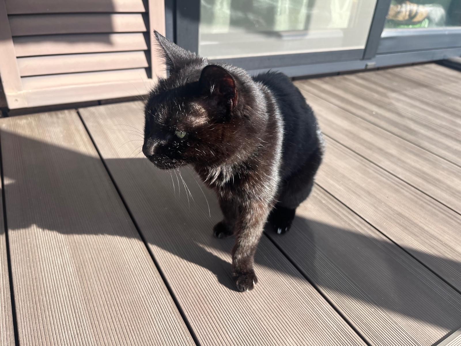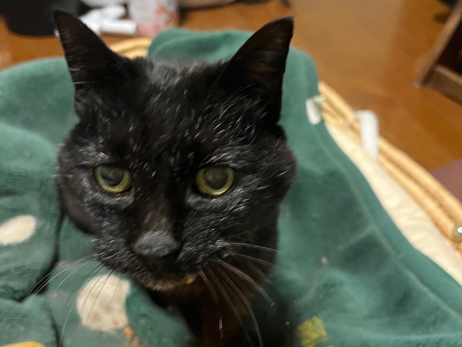 毛は黒く、緑色の首輪(保険会社のリストバンド)をつけています。