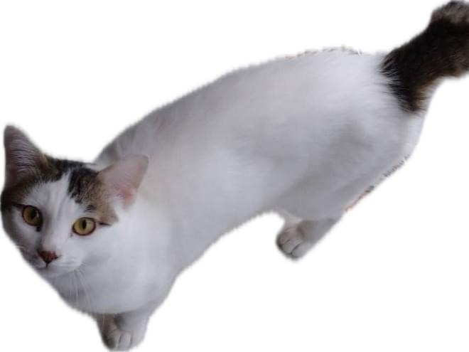 特徴は白猫で頭と尻尾、右の耳、裏の左手にキジ模様があります。