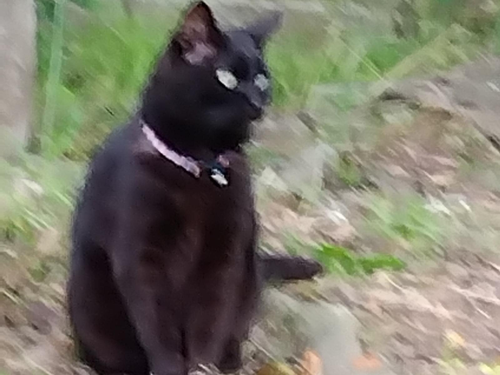 いつからかわからないけど、首輪をした黒猫が福岡市東区の青葉公園に野良猫と一緒にいます。エサを与えてる人がいるけれど、