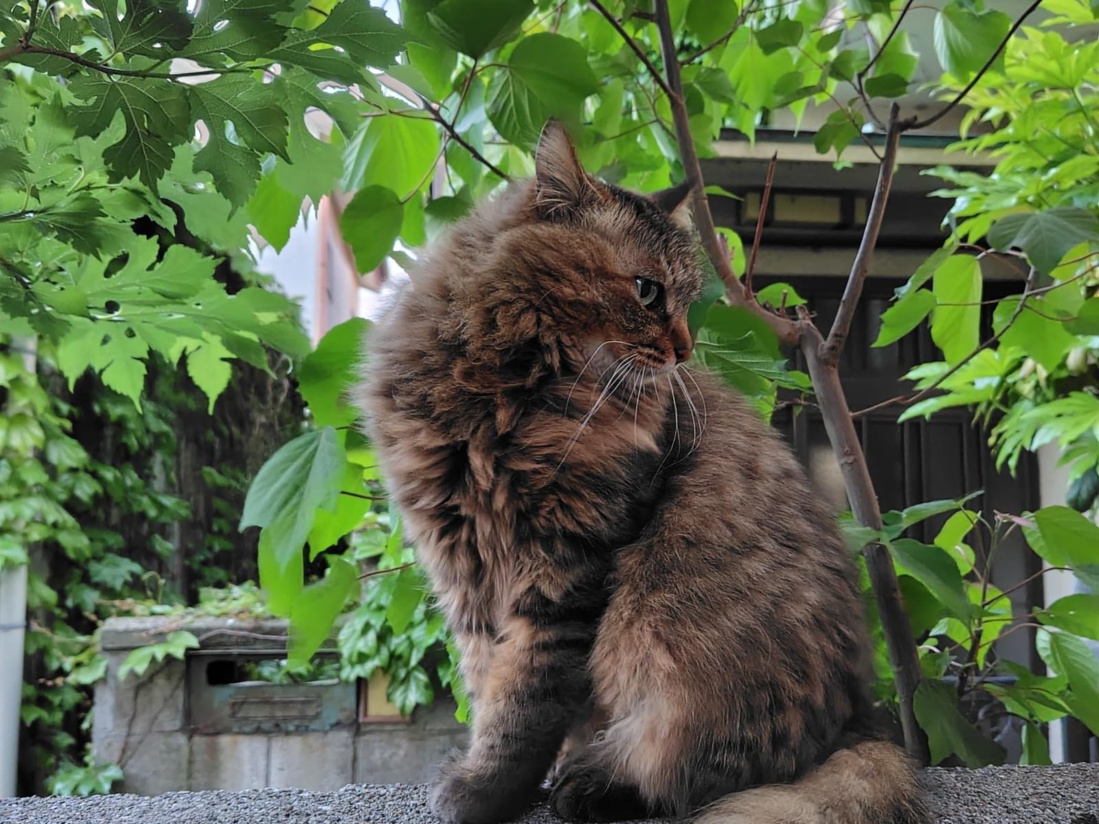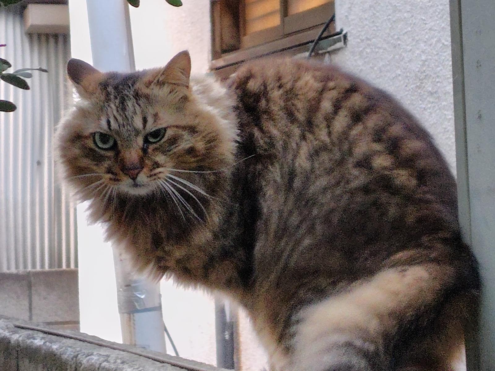 5月に入って よく見かけるようになりました。時々ご飯を食べに来ます。とても人懐こく、すりすりしたり、声をかけると走って近くに来たりします。全身がモフモフした感じです。しっぽもフサフサです。首輪はしていません。