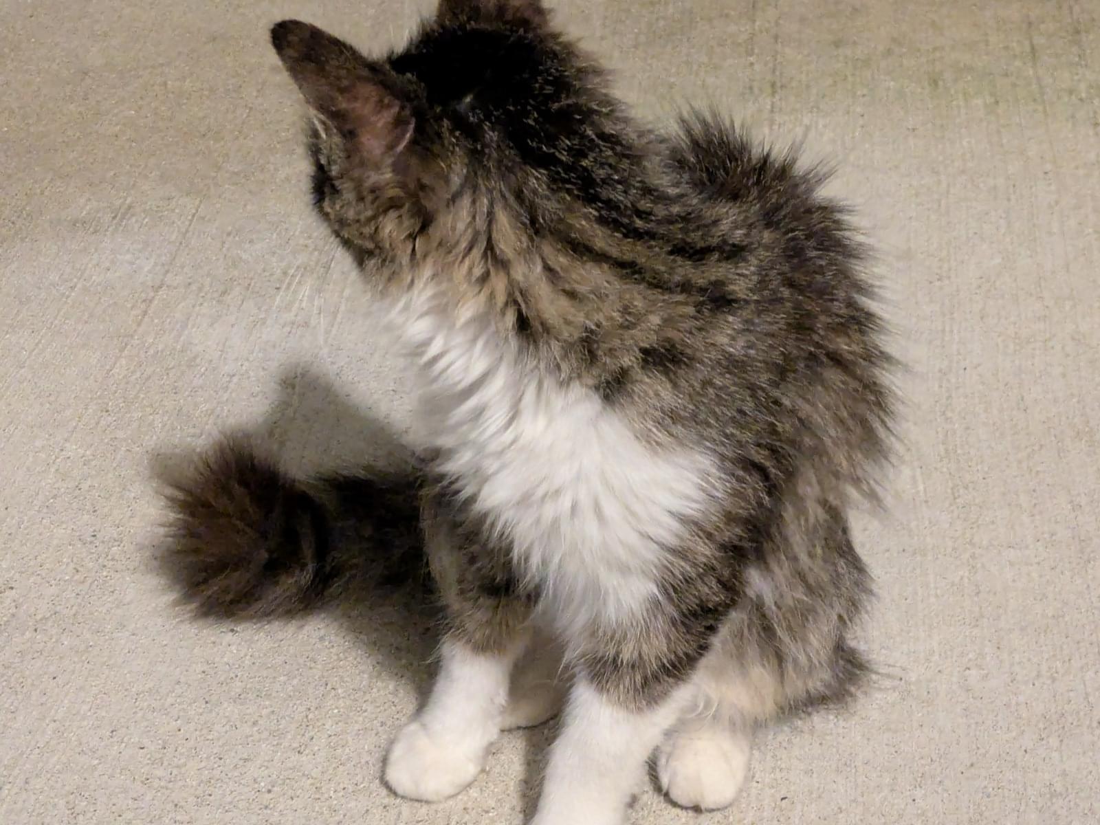 6/3の夜に家の付近で見かけました。グレーのキジトラで鼻に模様がある長毛の猫です。