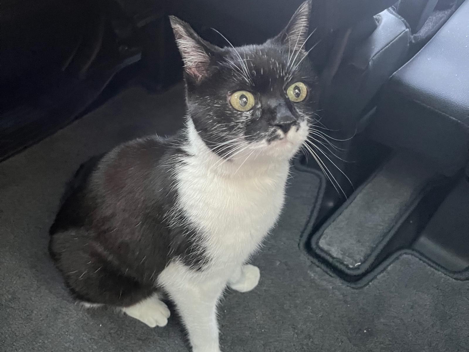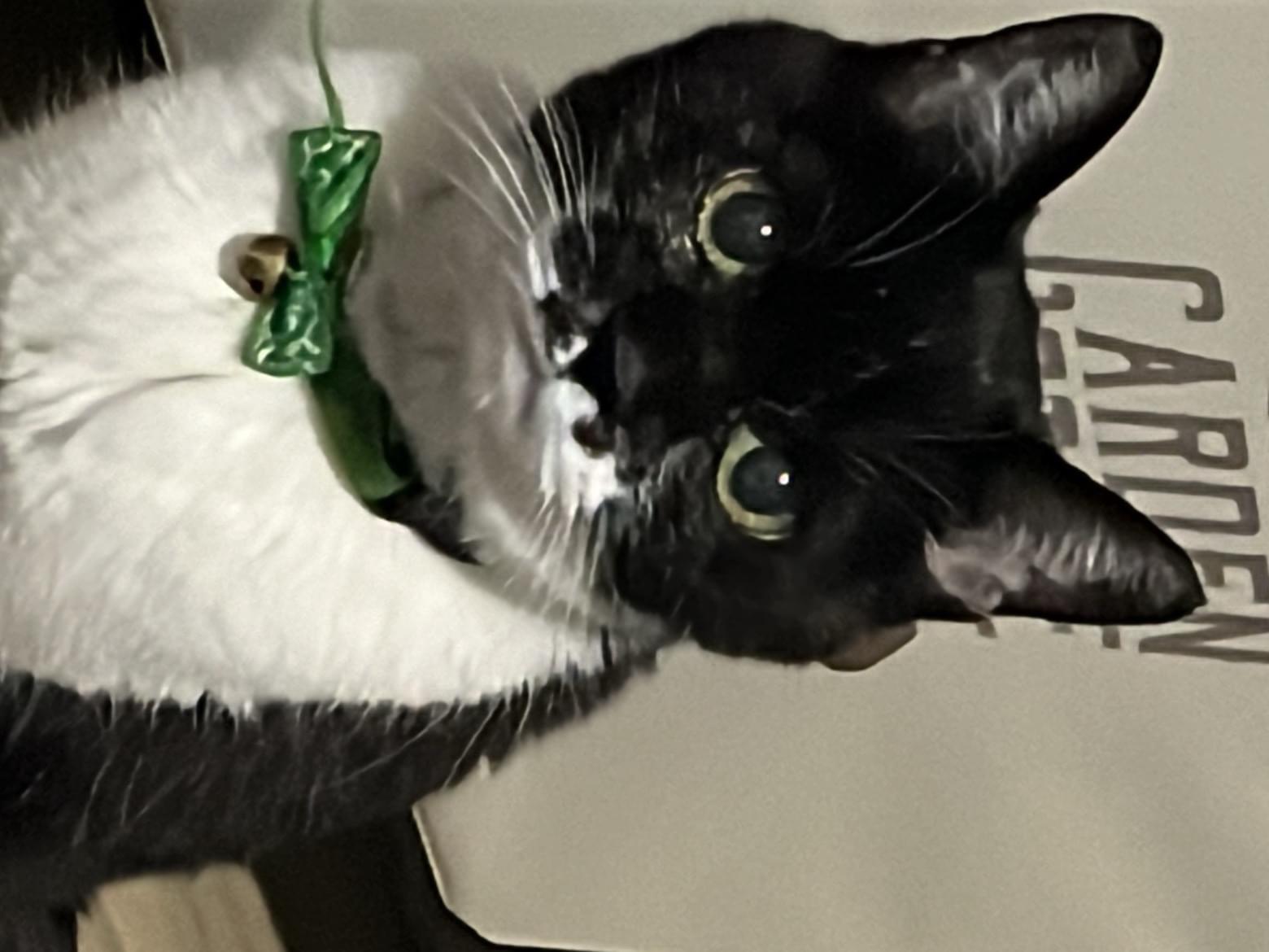 鼻の下にホクロのような模様のある黒と白の猫を探しています。