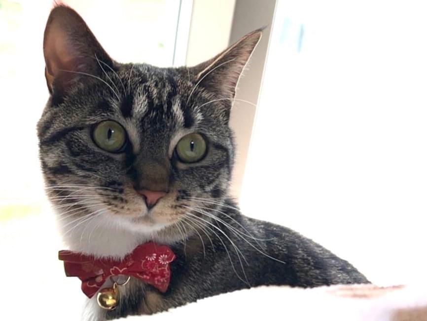 手足、首、お腹が白いキジトラです。2歳ですが小柄で痩せ気味体型。警戒心が高いですが食いしん坊なのでご飯には食いつきます。