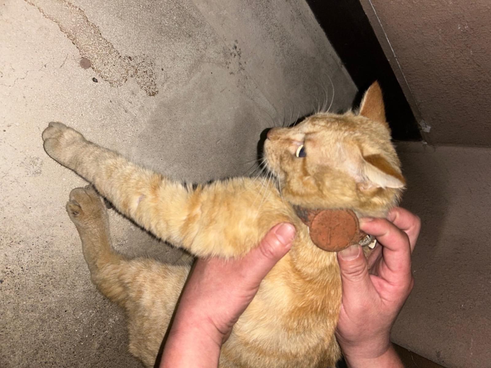 古くなってて多分茶色の首輪にアップルのエアタグがついている首輪をしていました。