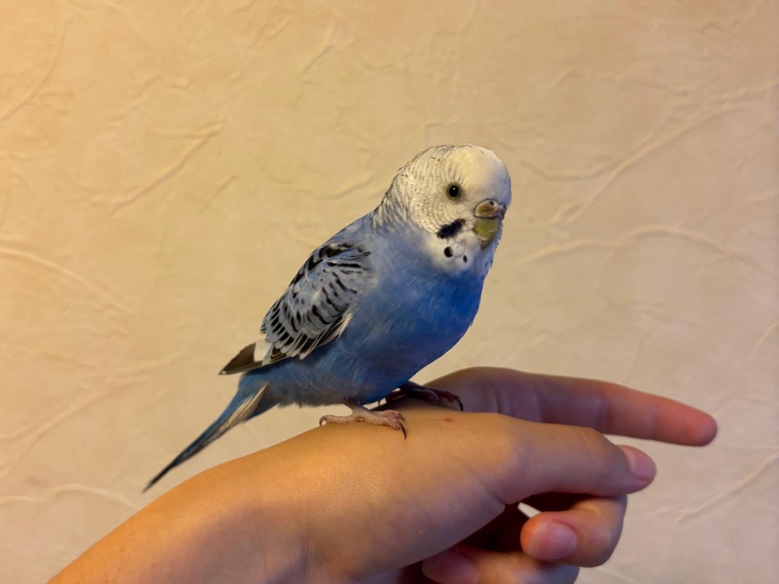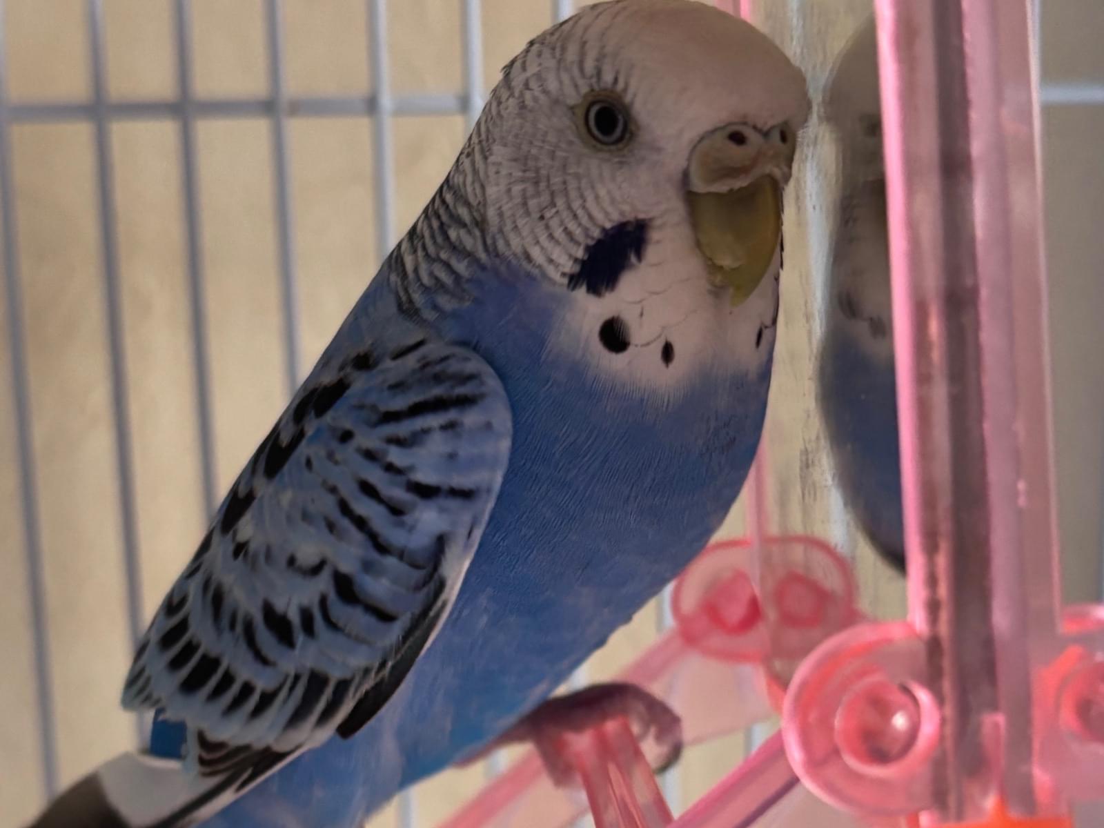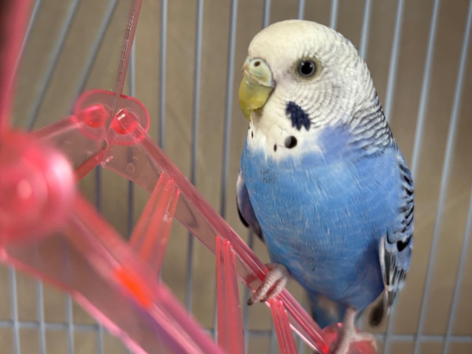 西武小学校の庭で2025/06/12の朝10:30頃保護しました。おじいちゃんのセキセイインコで目がまんまるでかわいいです。羽根には黒い模様があります。