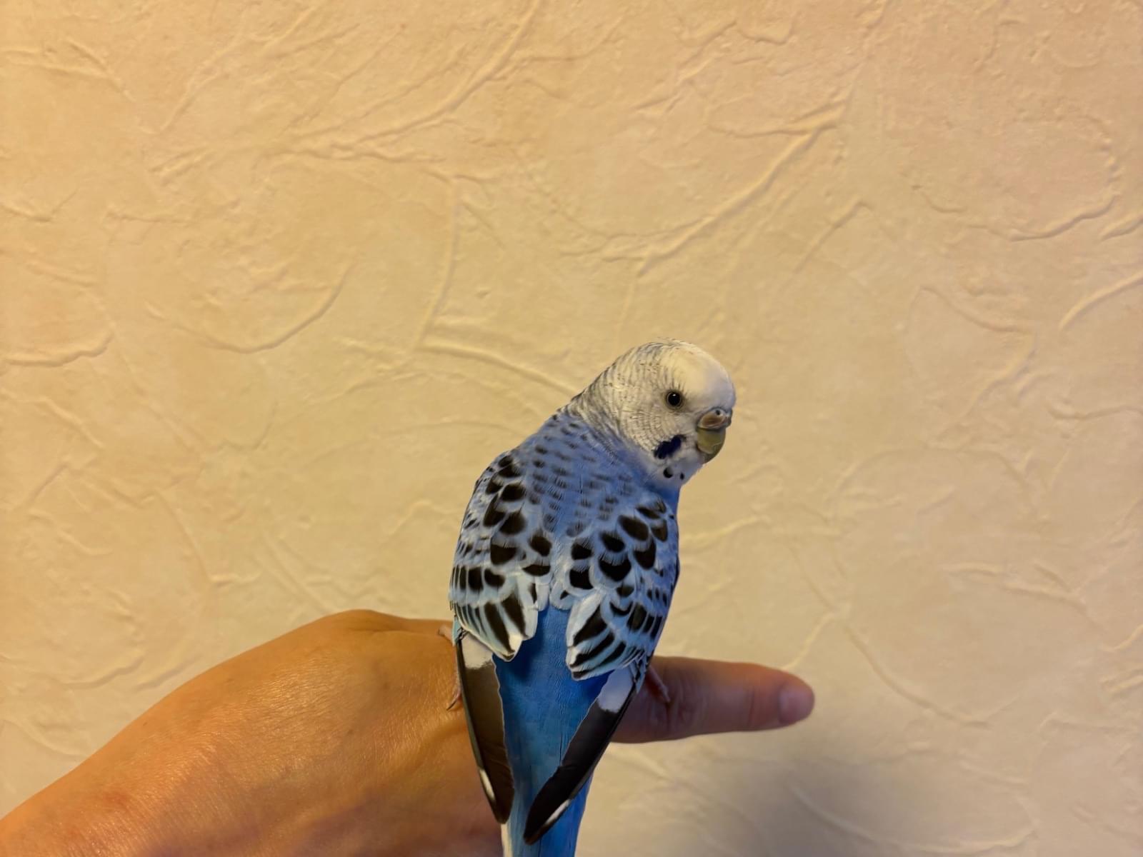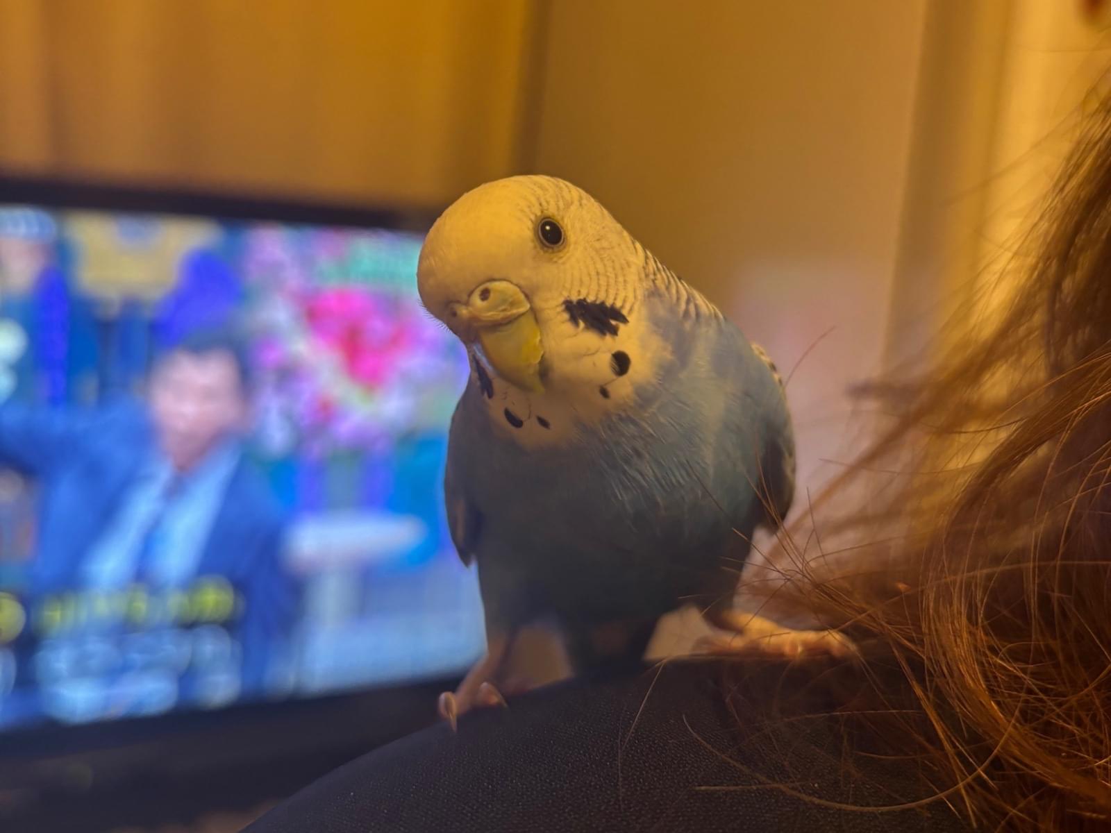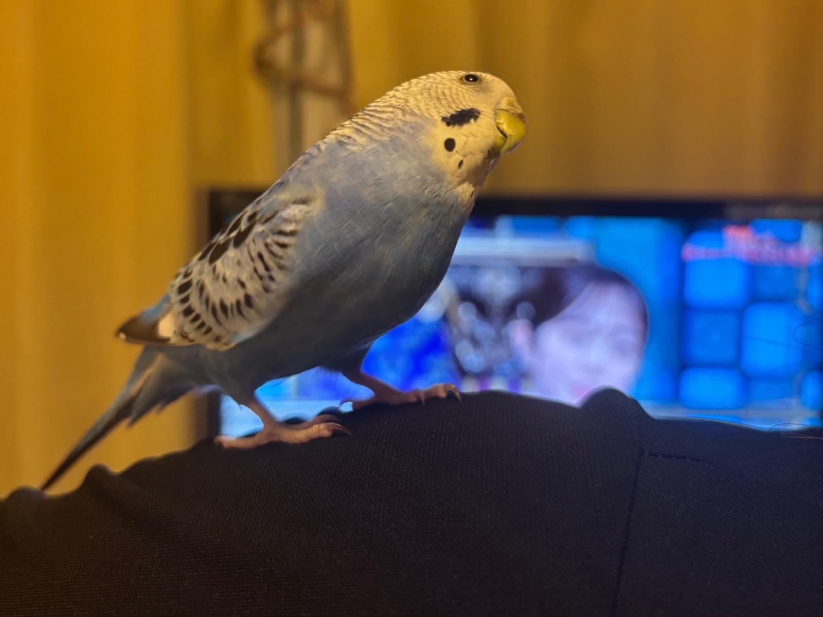西武小学校の庭で2025/06/12の朝10:30頃保護しました。おじいちゃんのセキセイインコで目がまんまるでかわいいです。羽根には黒い模様があります。