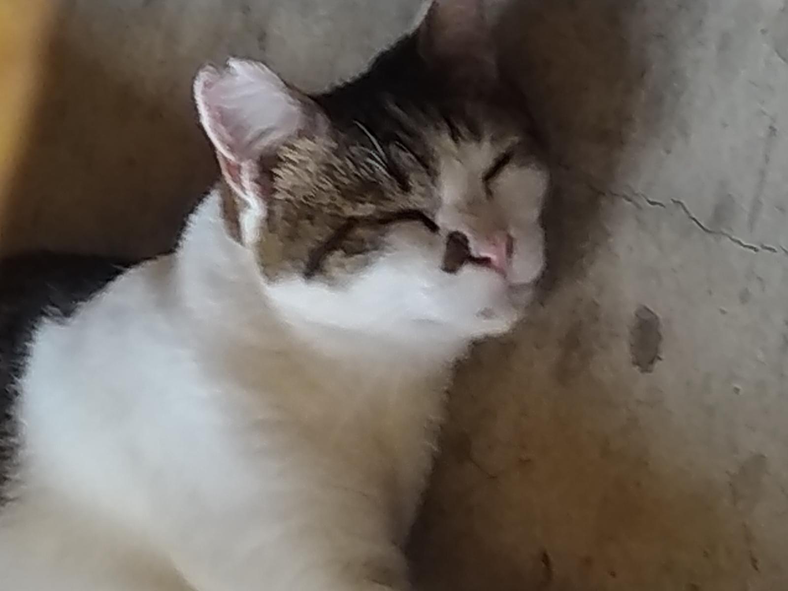 足不自由な前足脱臼の白キジ猫 耳カット有り。