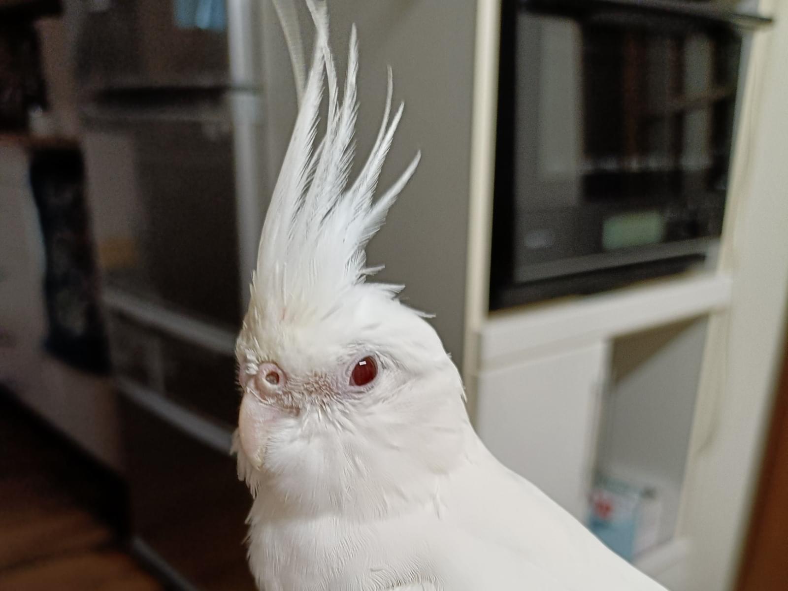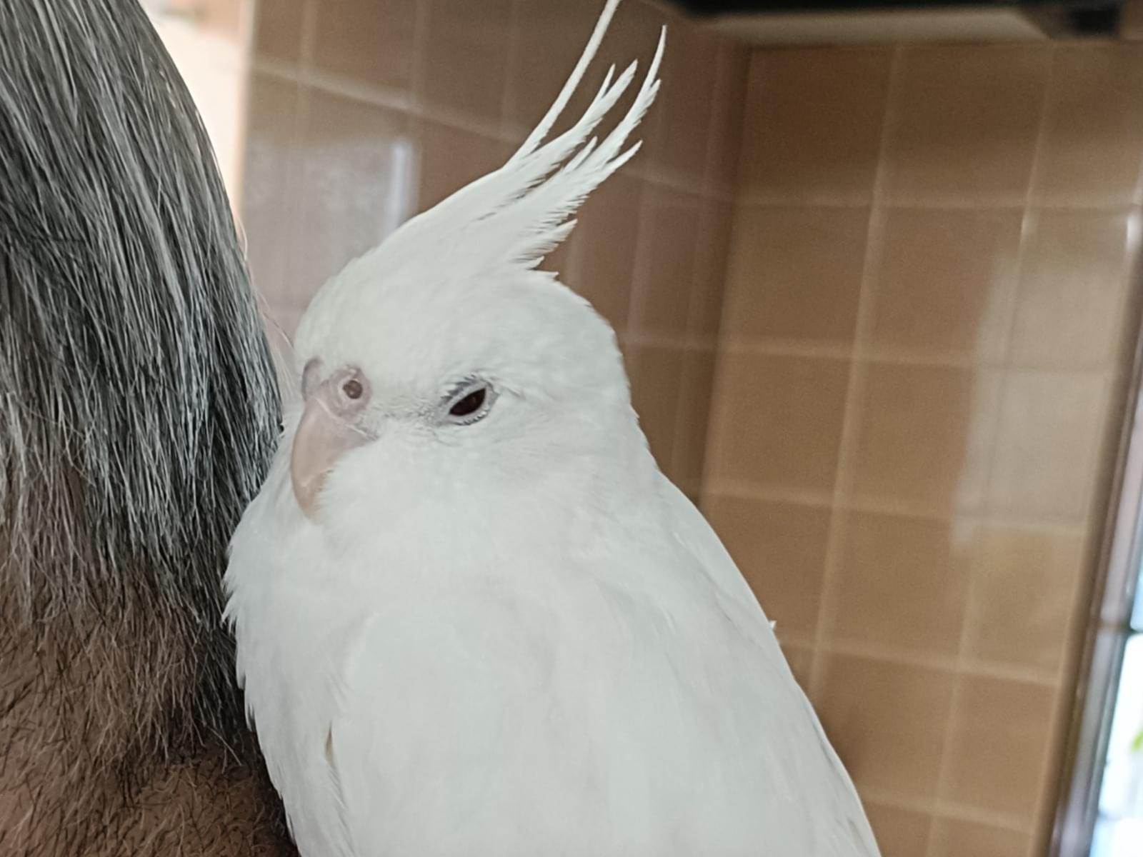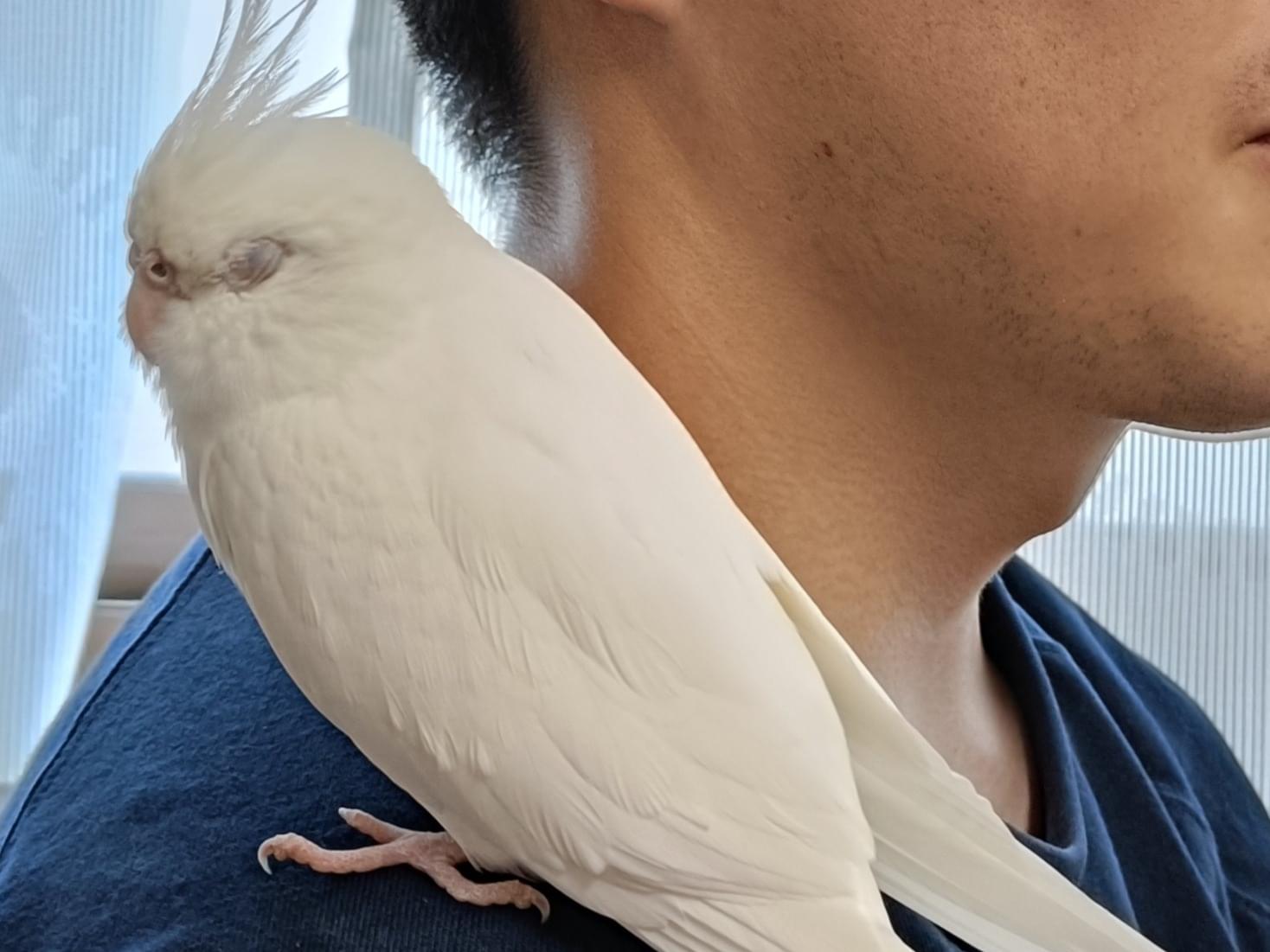 全身真っ白でオカメインコにしては小さいサイズです。人の肩に乗るのが好き。手乗りではなく肩乗り。手でつかまれるのは苦手です。さみしがりやで怖がりです。知らない場所や音にびっくりするとパニックを起こして大きな声で鳴いてやみくもに飛び回ります。