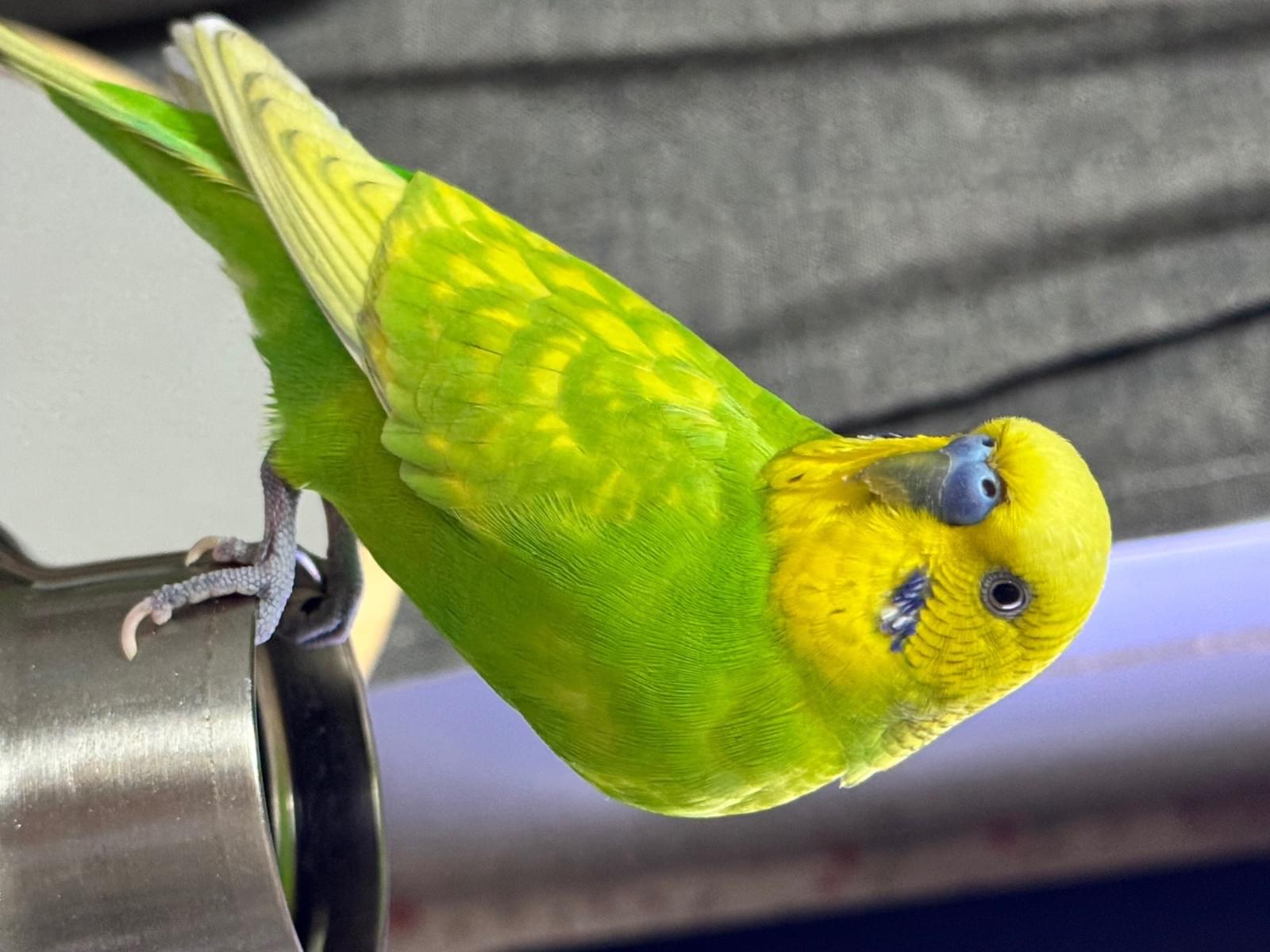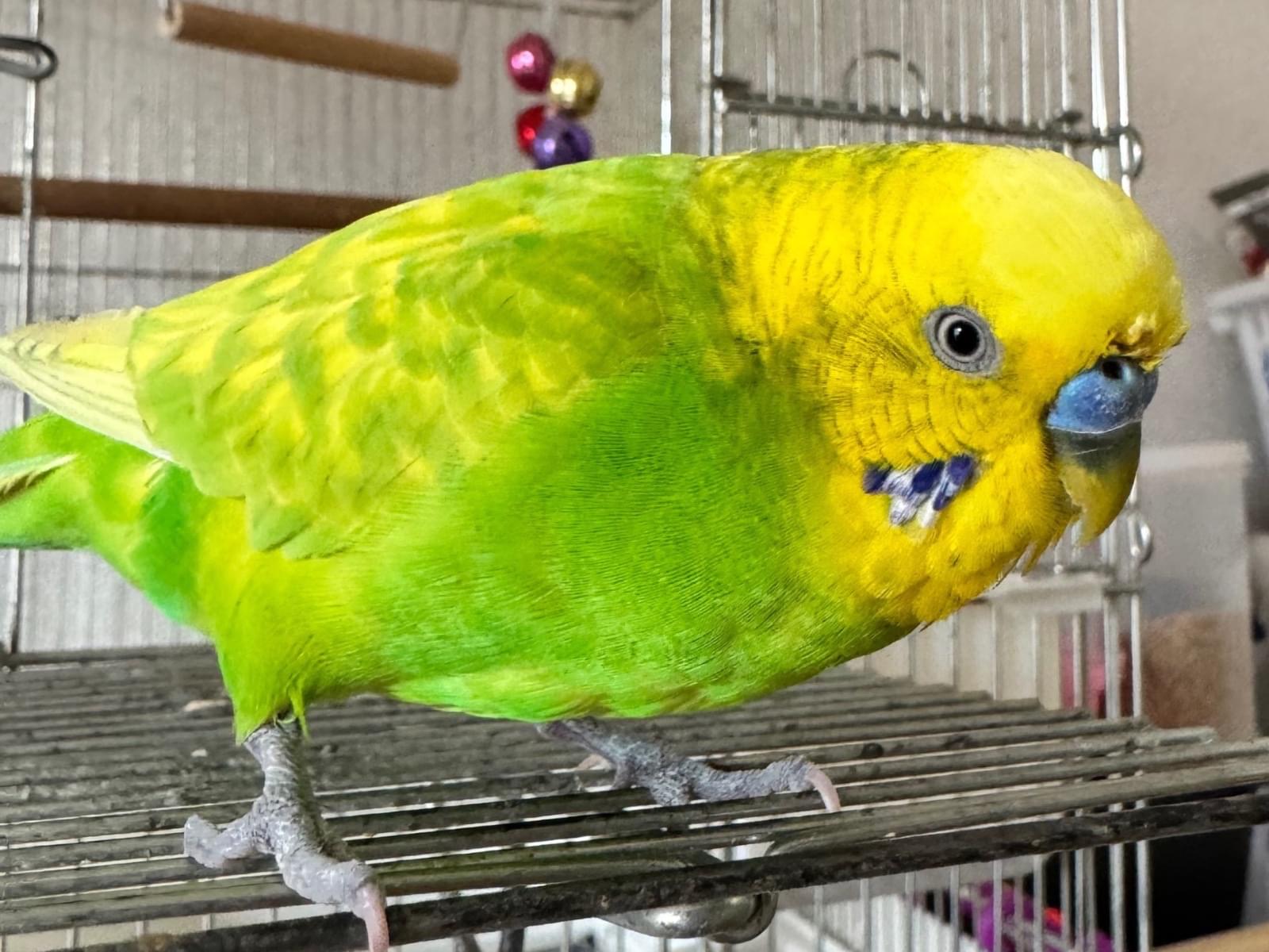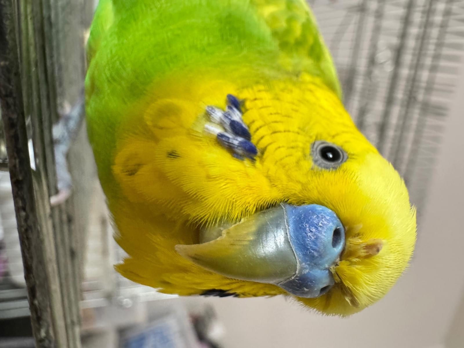 鼻が青色のオス、頭が黄色、体は緑、羽根に黄色の斑点有、両頬に青と白が混ざった毛が生えてます。