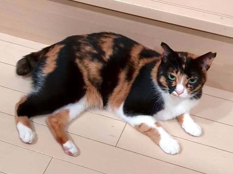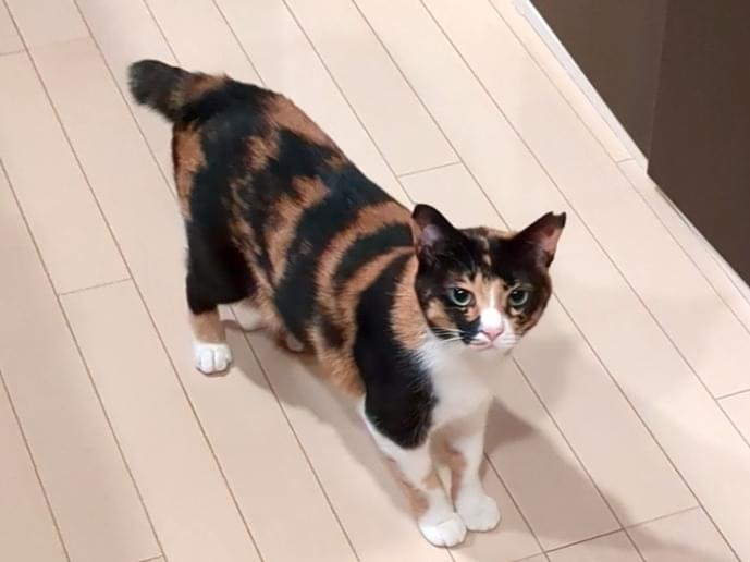 三毛猫で尻尾が短いです。
