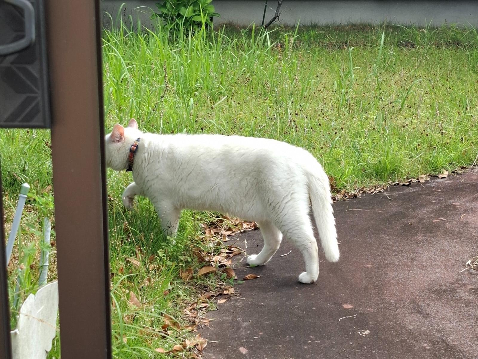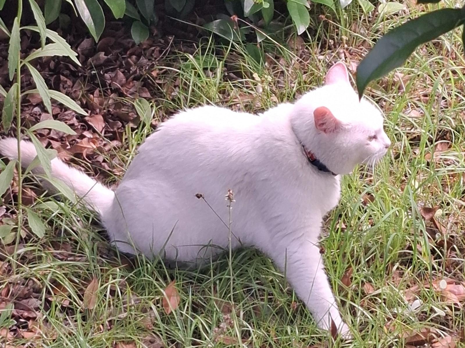 私自身も白猫(長毛)を探していて「庭に白猫がいます」と連絡をもらい確認に伺うと 違う白猫(オッドアイ)青い首輪をつけた子がお庭にいました。