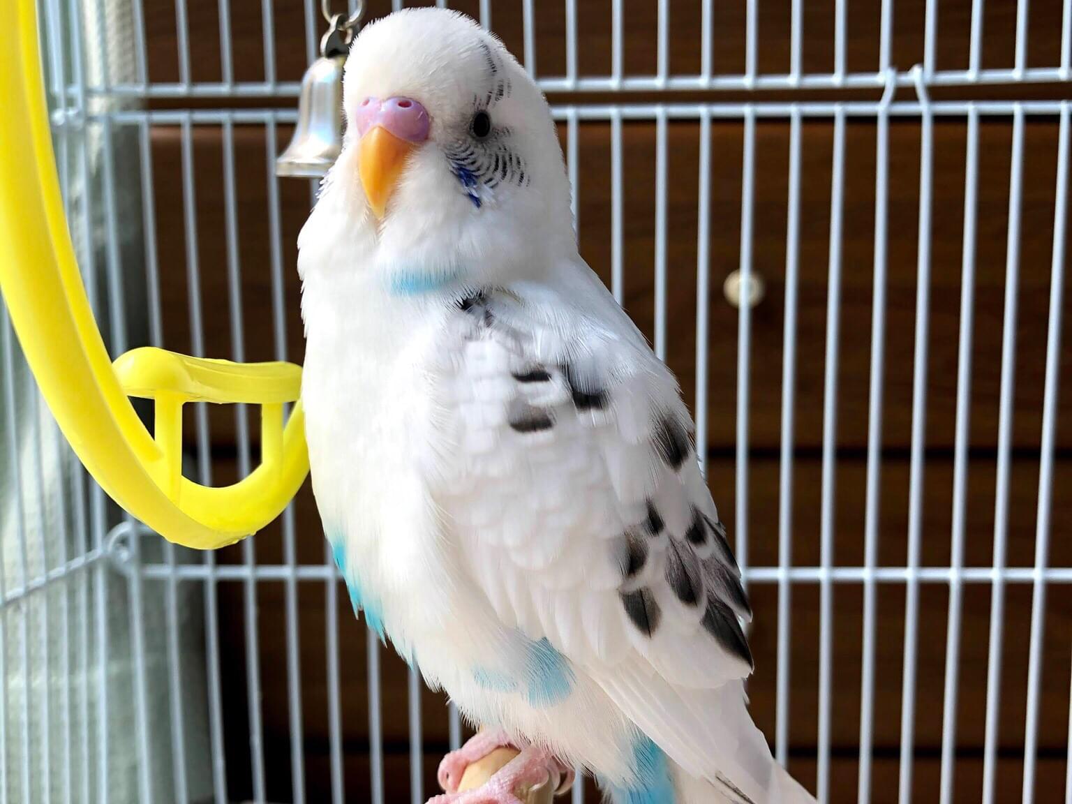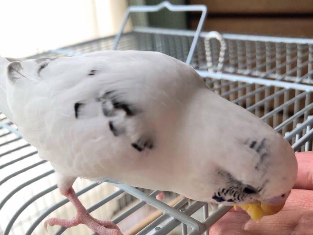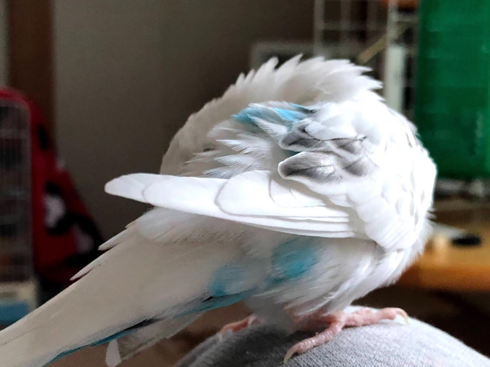 全体的に、白で背中に、グレー、お腹に水色、左側の首に水色があります。