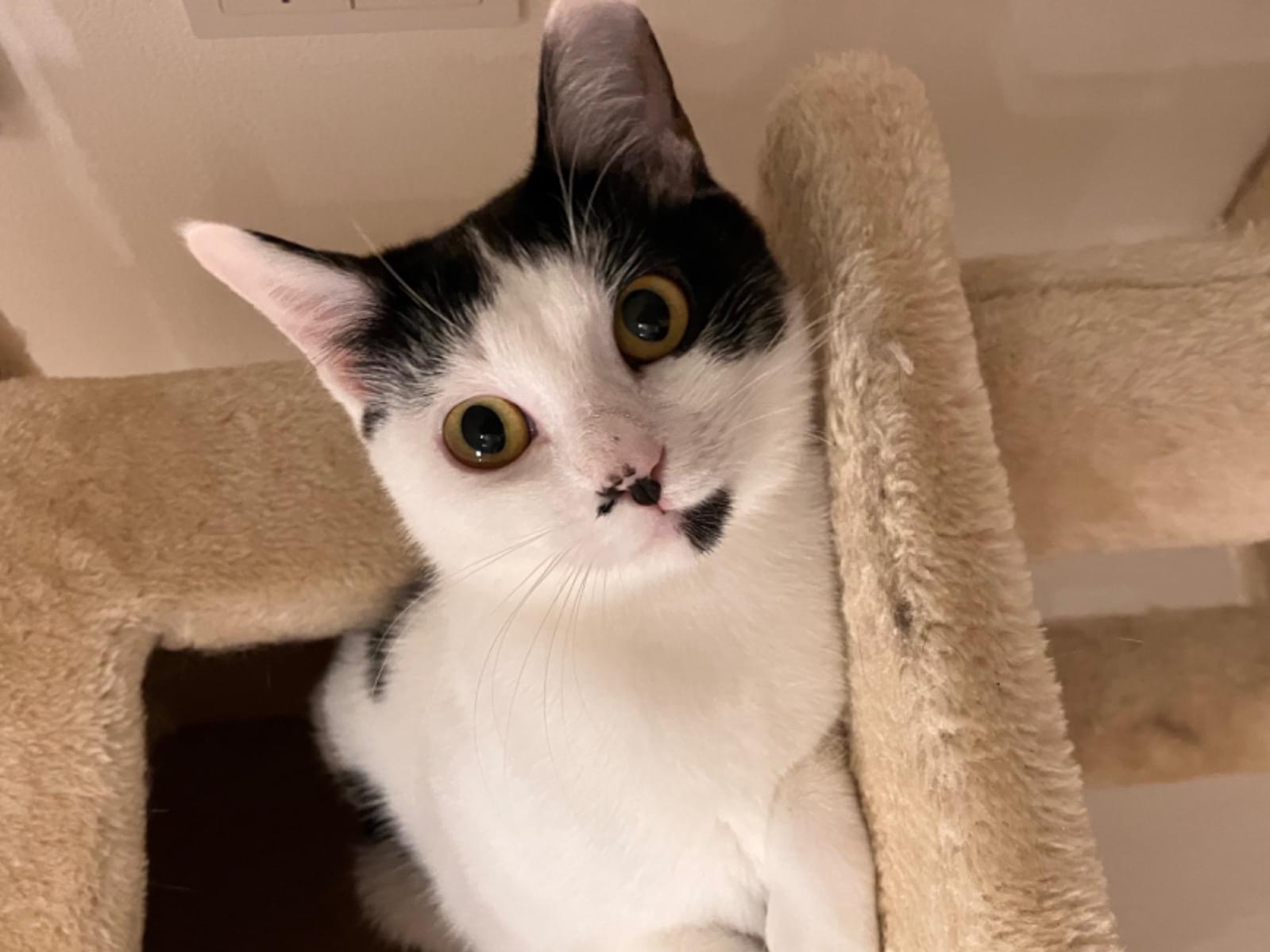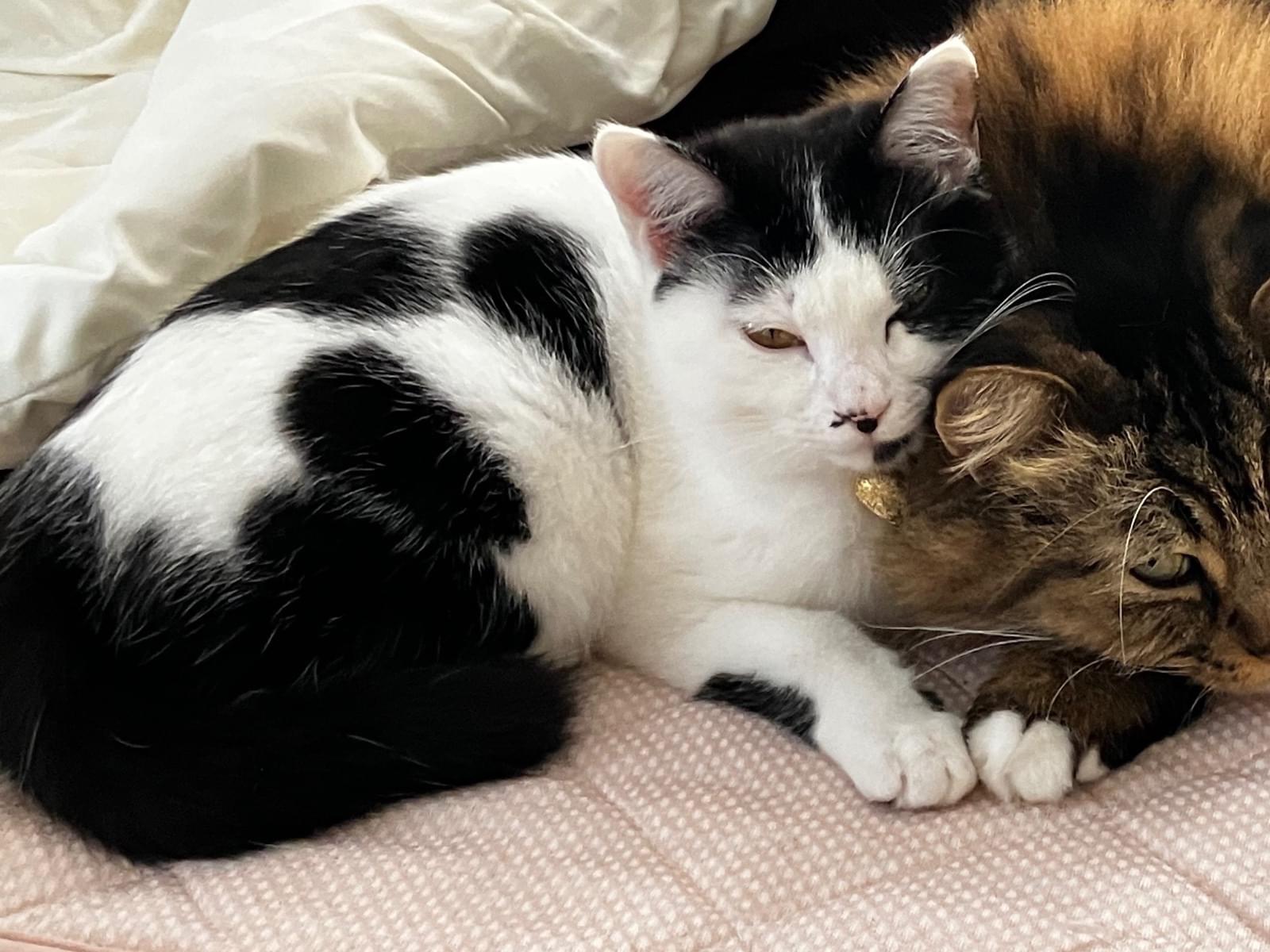 白地に黒の模様です。片方がおでこまでのハチワレ。