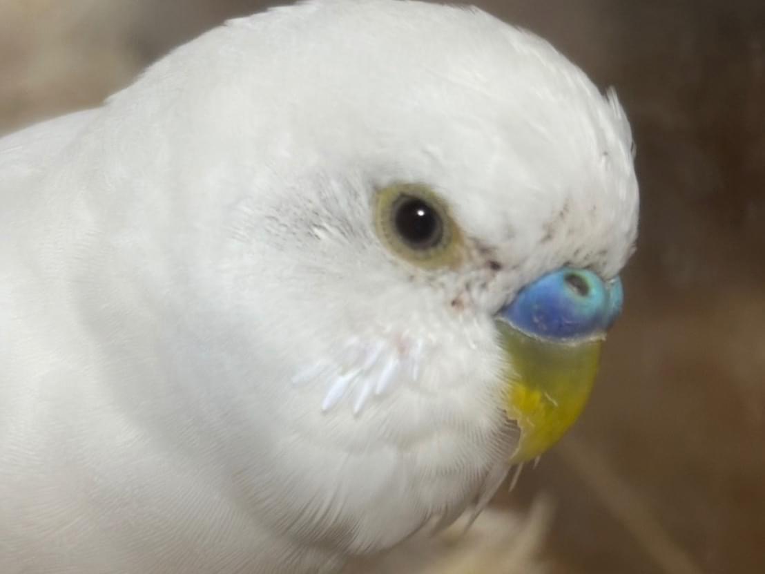 ちっちこんにちは、もちもちなど言葉は少ししか覚えていません。体は白く首元と鼻が青いオスです。手が苦手で肩によく乗ってきます