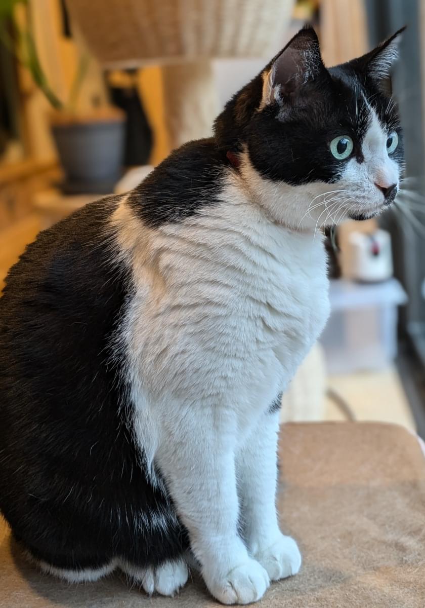 体は黒い部分が多めの白黒ハチワレです。