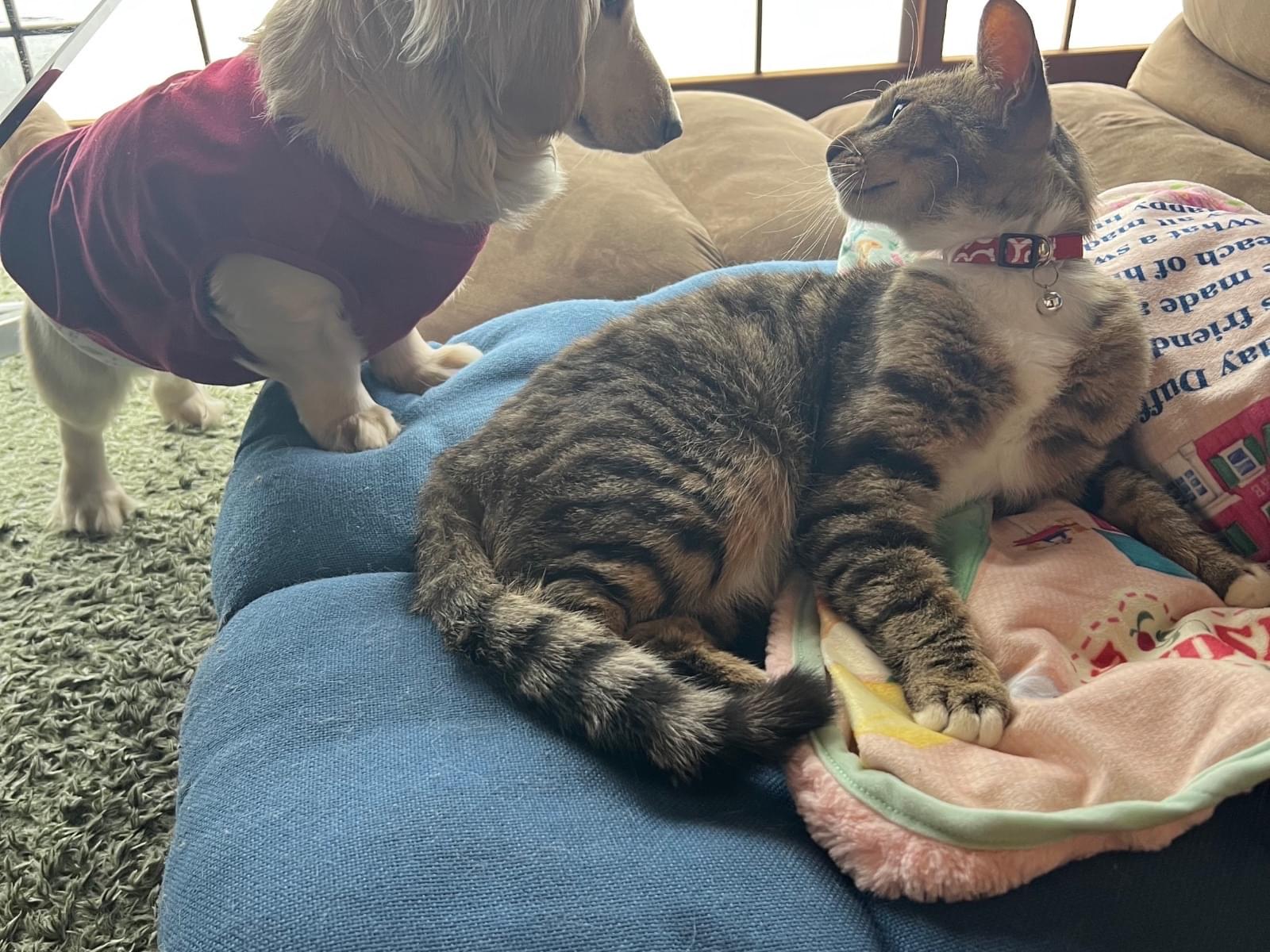 緑色の鈴がついた首輪に水色のシンプルな洋服を着ています。