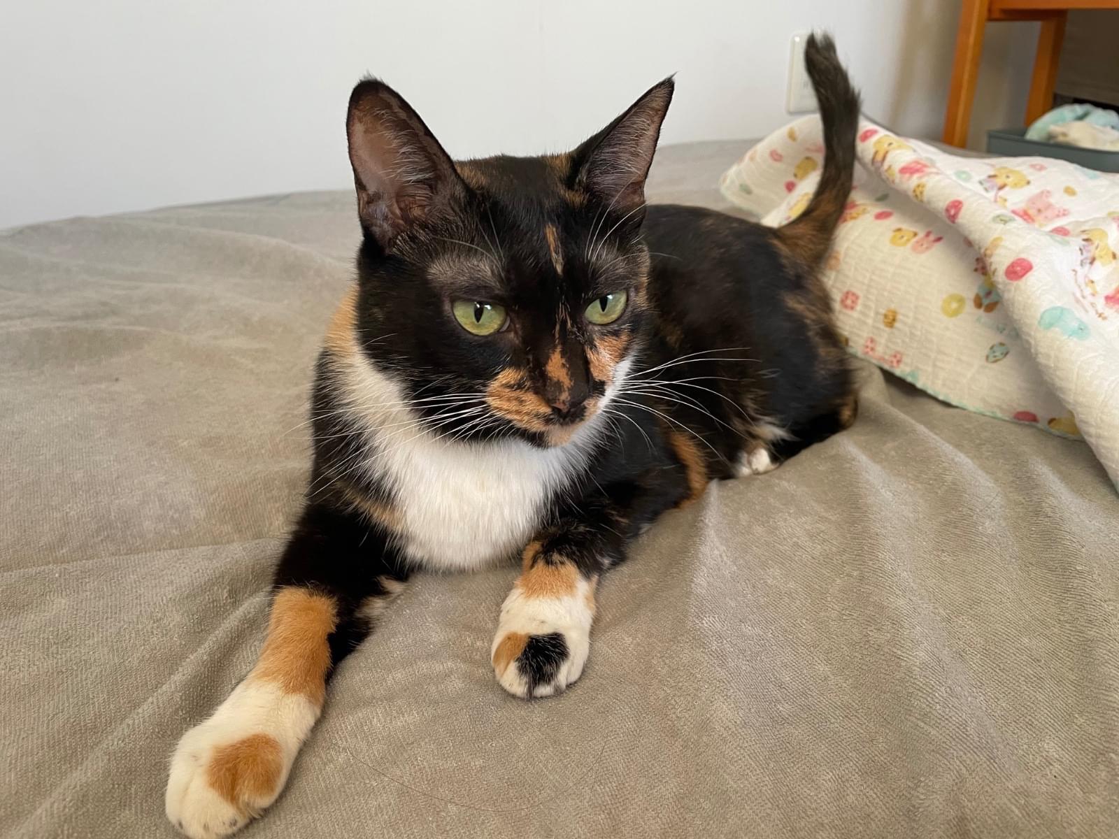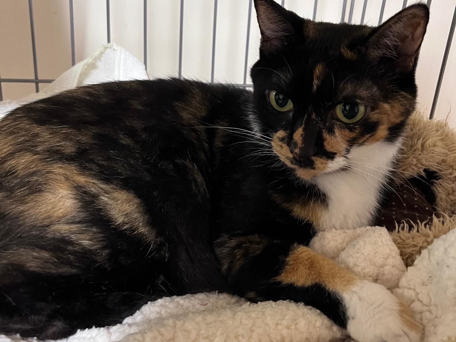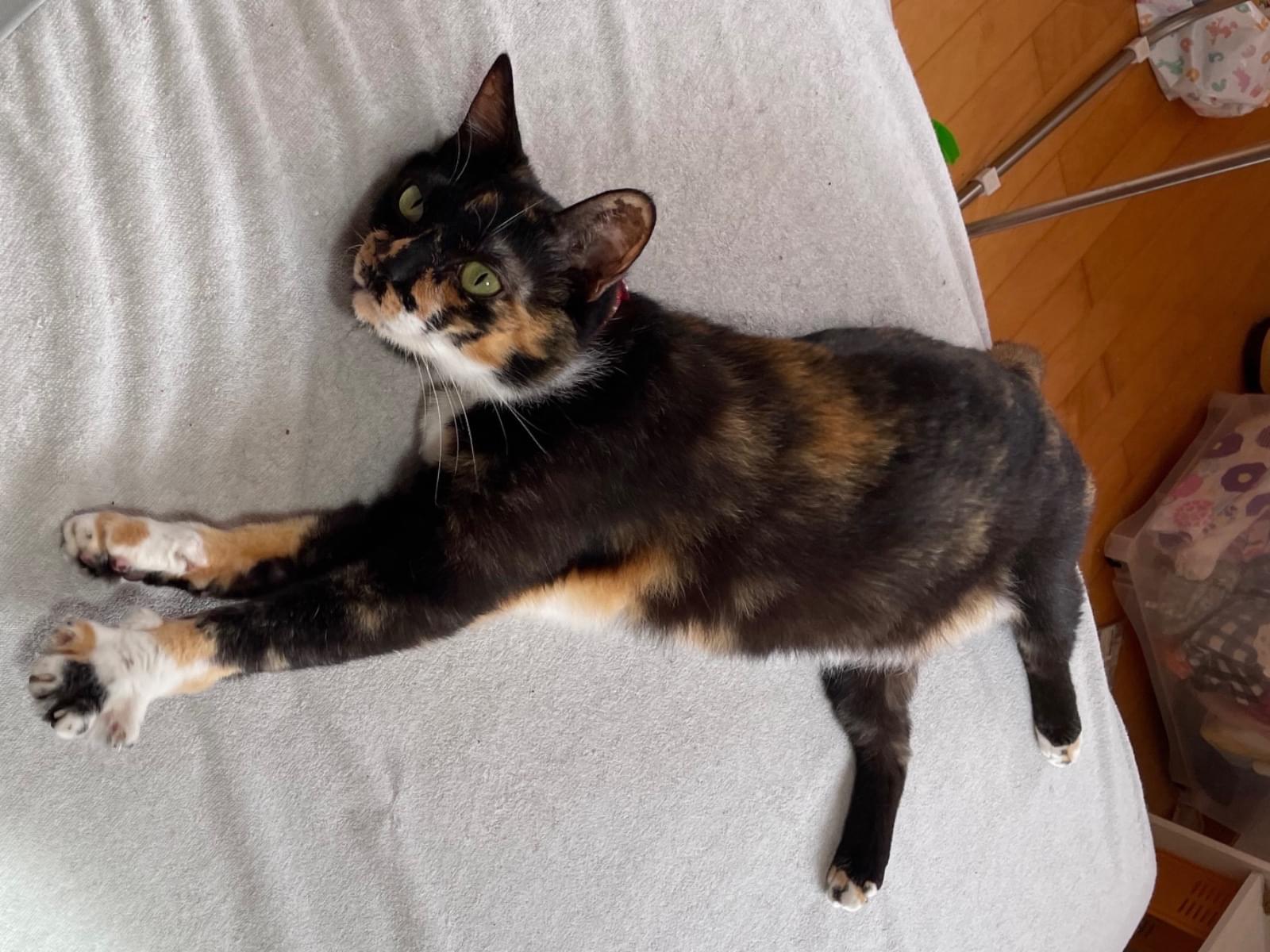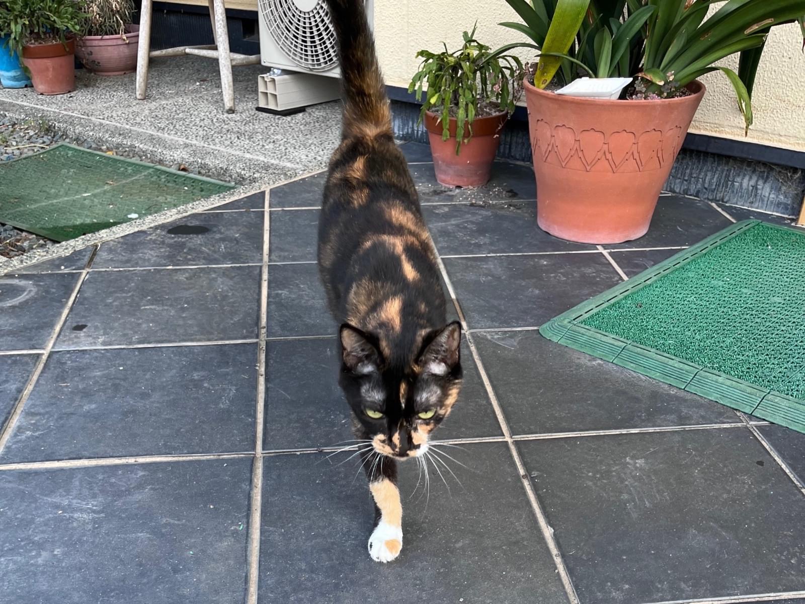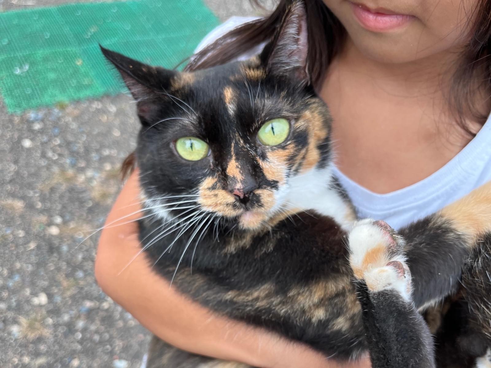 お腹白め、背中はサビ柄、首輪なし、マイクロチップ有り、声は高めです。