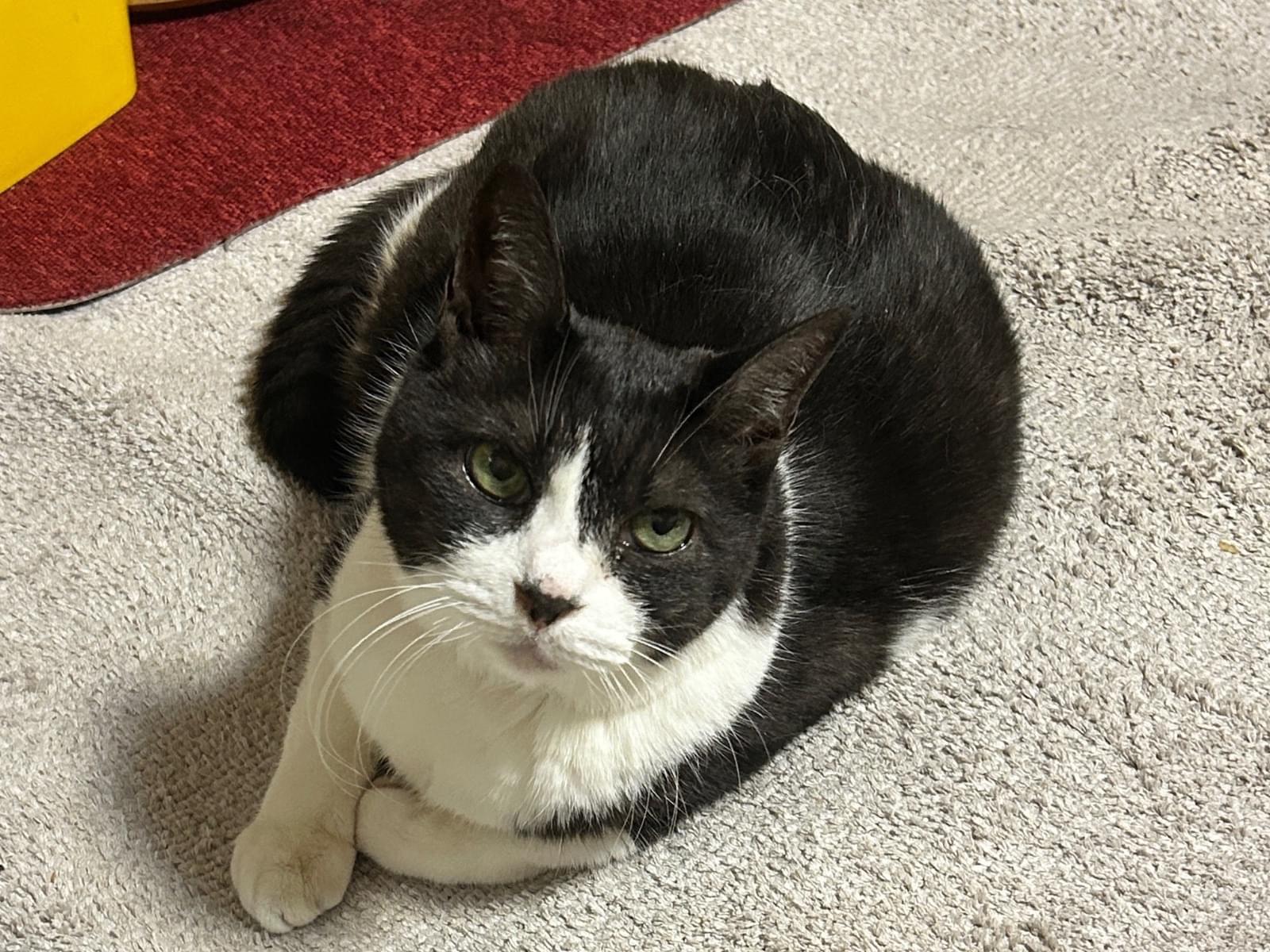 白黒のハチワレ、尻尾長め、手足は白、声はしゃがれ気味、首輪なし、去勢済み、16歳のおじいちゃんです。