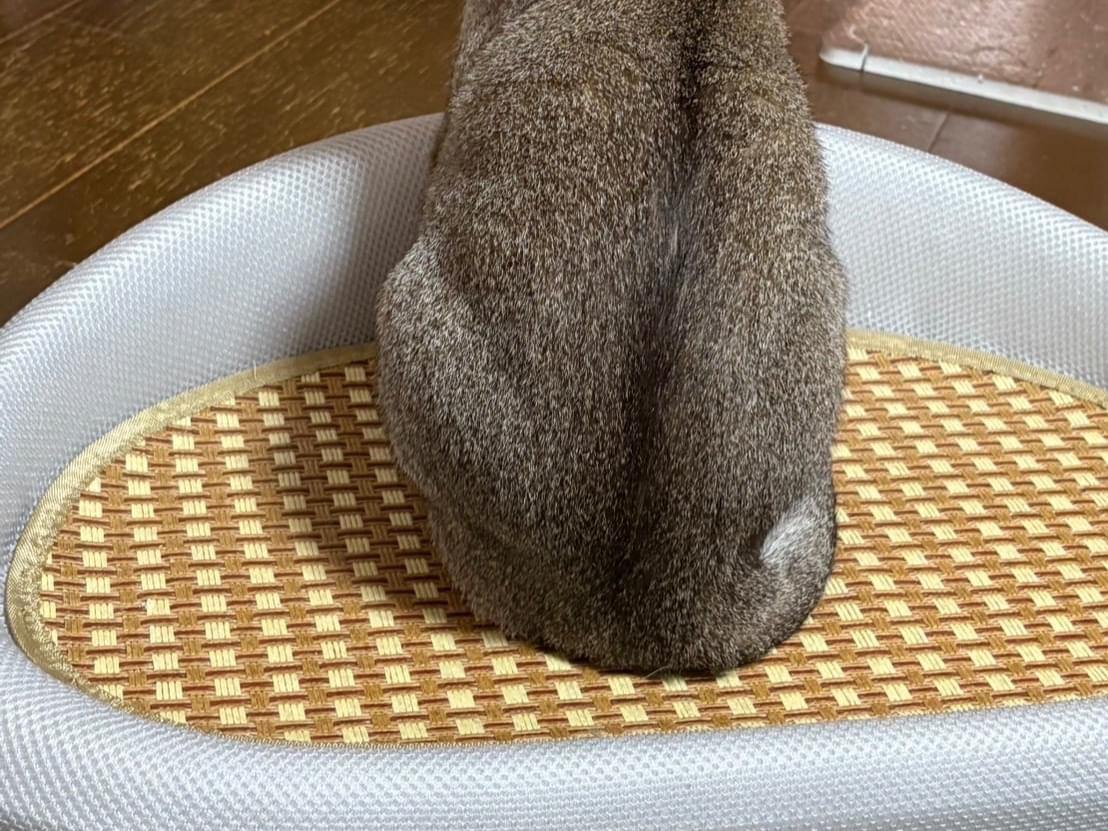 小柄で頭が小さく目が大きいシンガプーラ。後ろ足が少しガニ股で薄い茶色に背中に濃い茶色の線と足に横縞