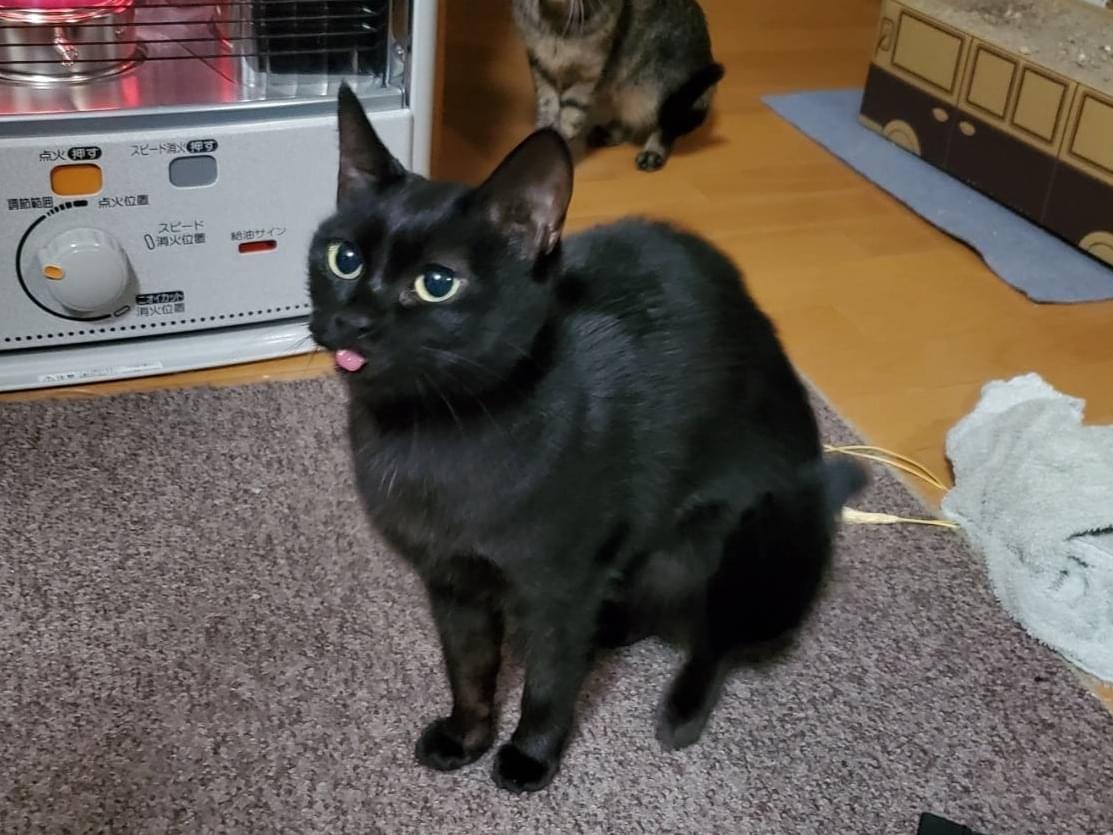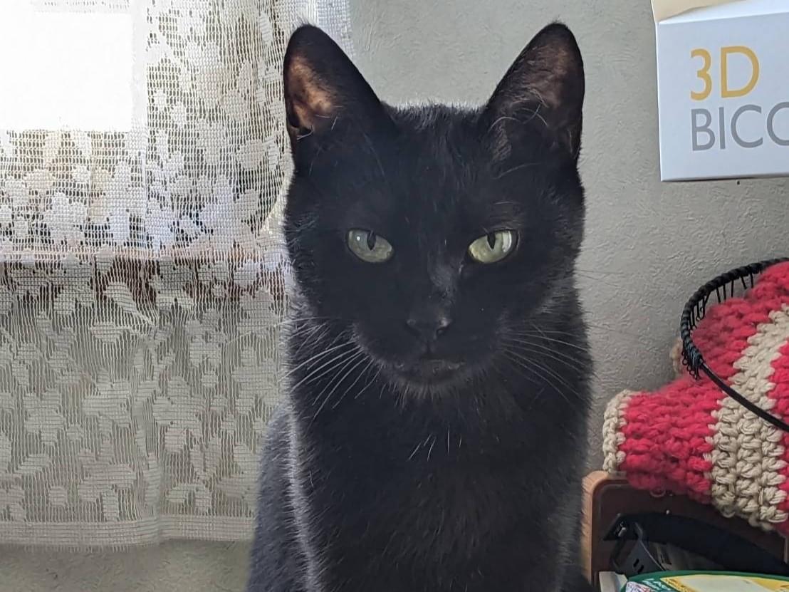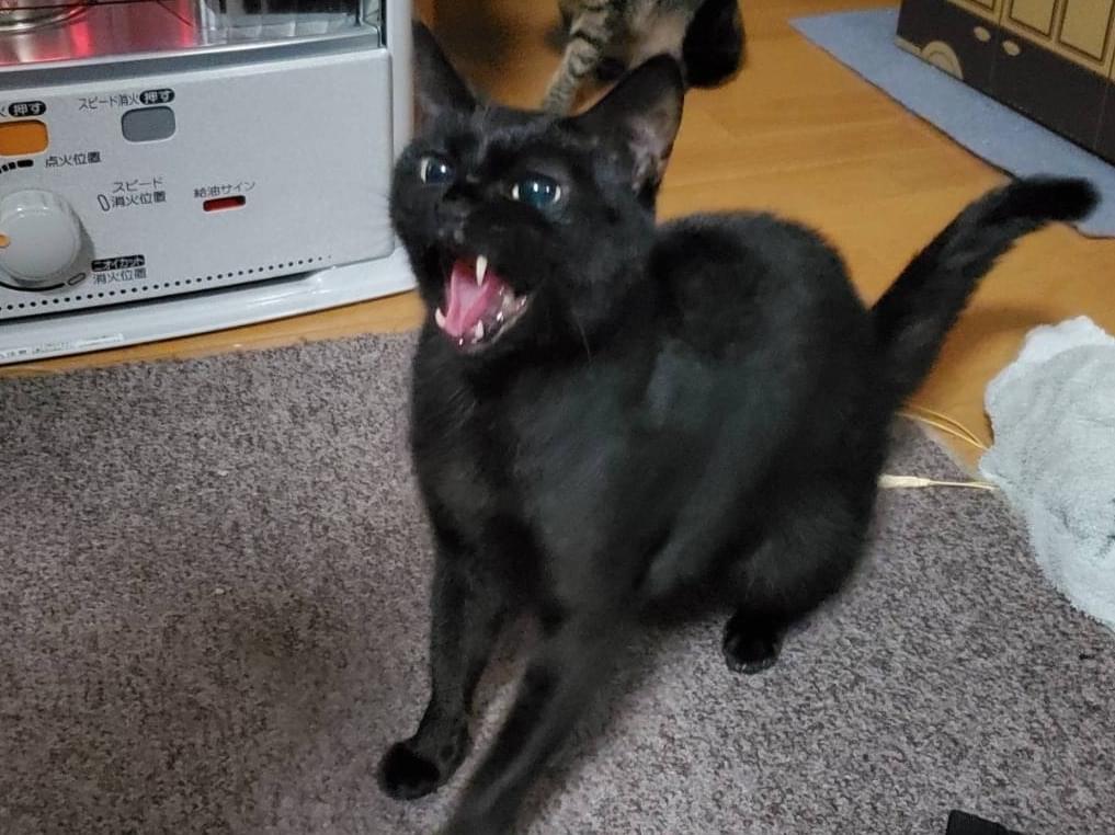 ベースは真っ黒てすが、目が少し近く、目の上の毛が薄い。パラパラと白い毛が混ざっていて、首の後ろに多め。右上の犬歯がない。声は高い。