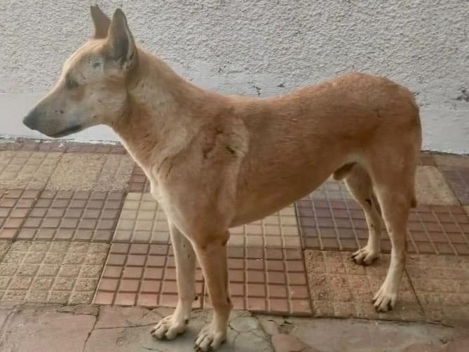 とても優しい子で、人や車を怖がります。外れている可能性もありますが、青い首輪に赤いリードを付けています。