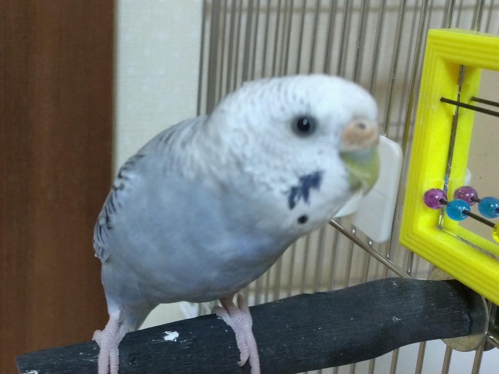 頭は白っぽく、身体はブルー、背中は黒の縞模様のセキセイインコを探しています。