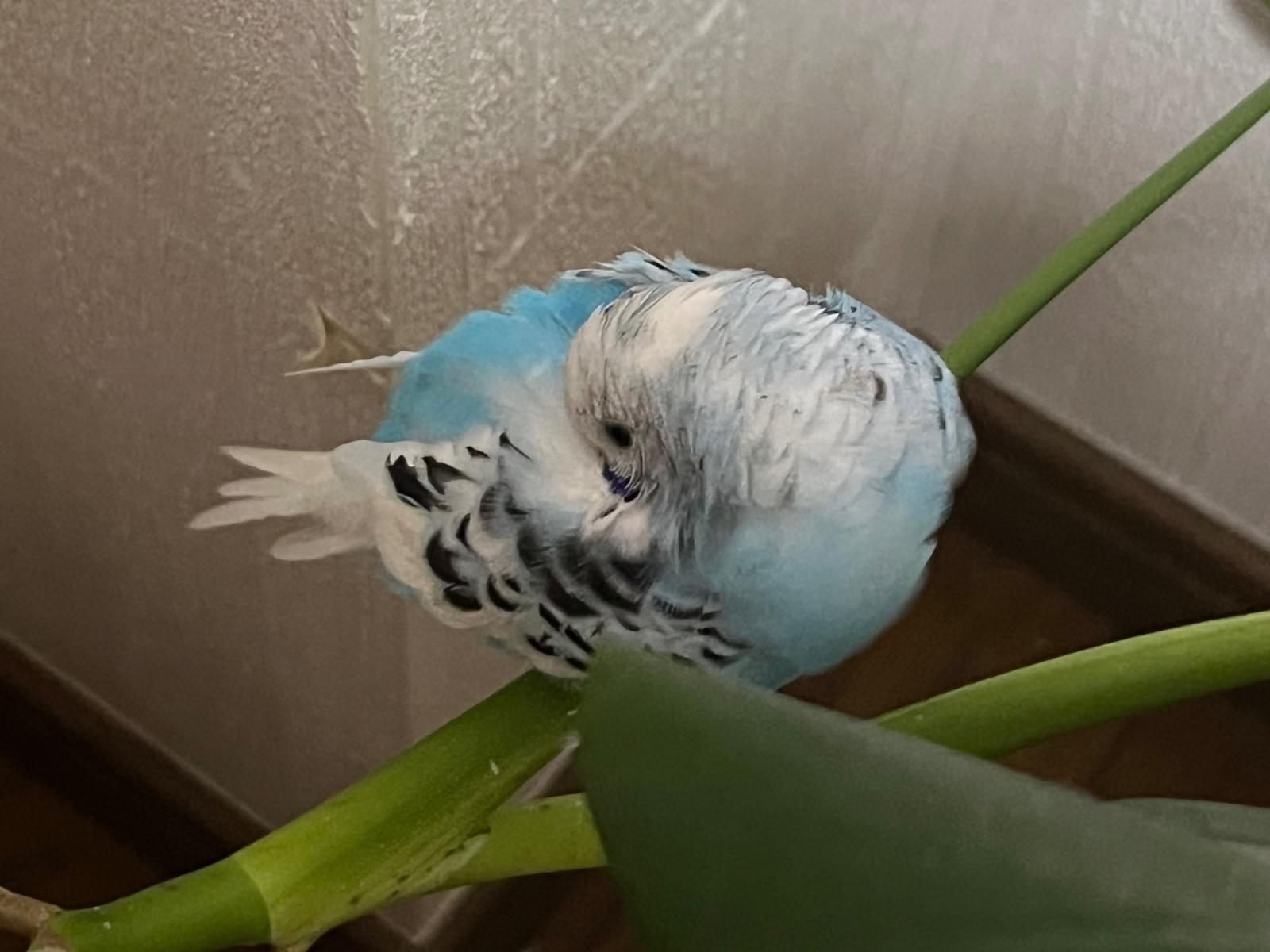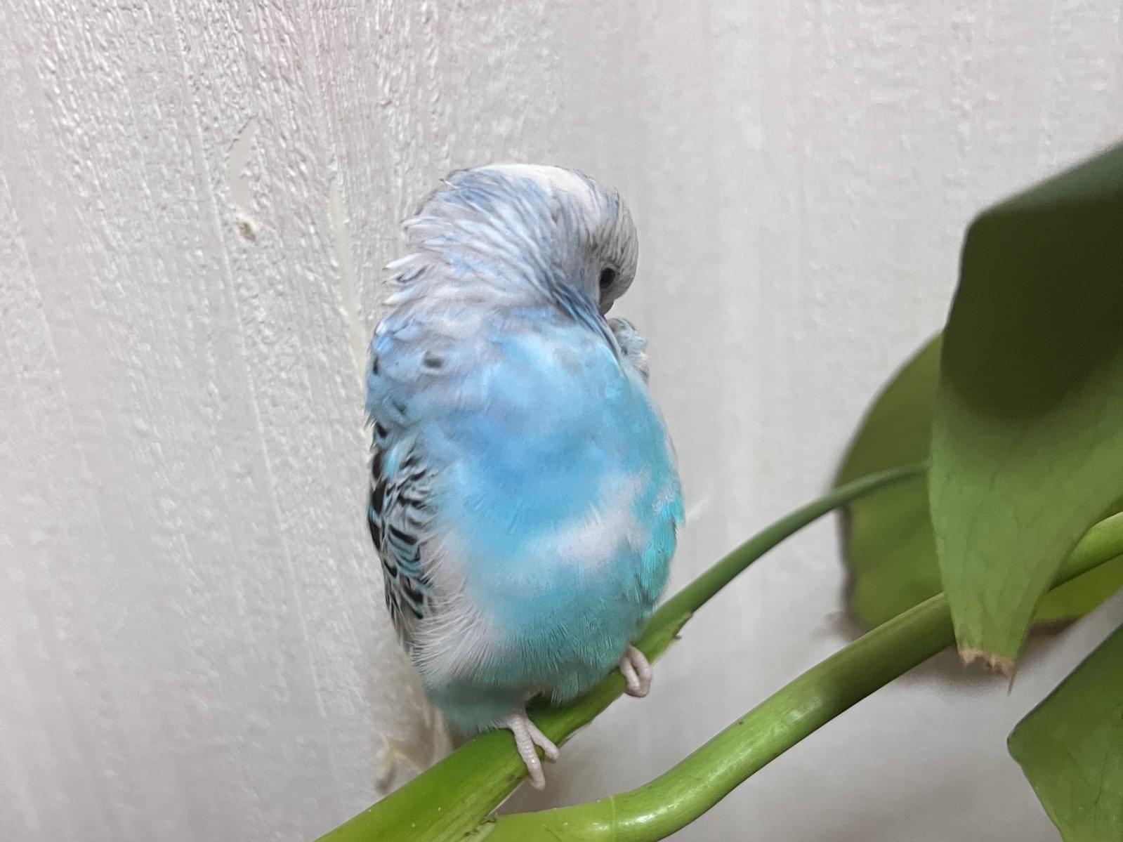 特徴は、頭と尾羽が白で体が水色。後頭部に横の線が入っています。