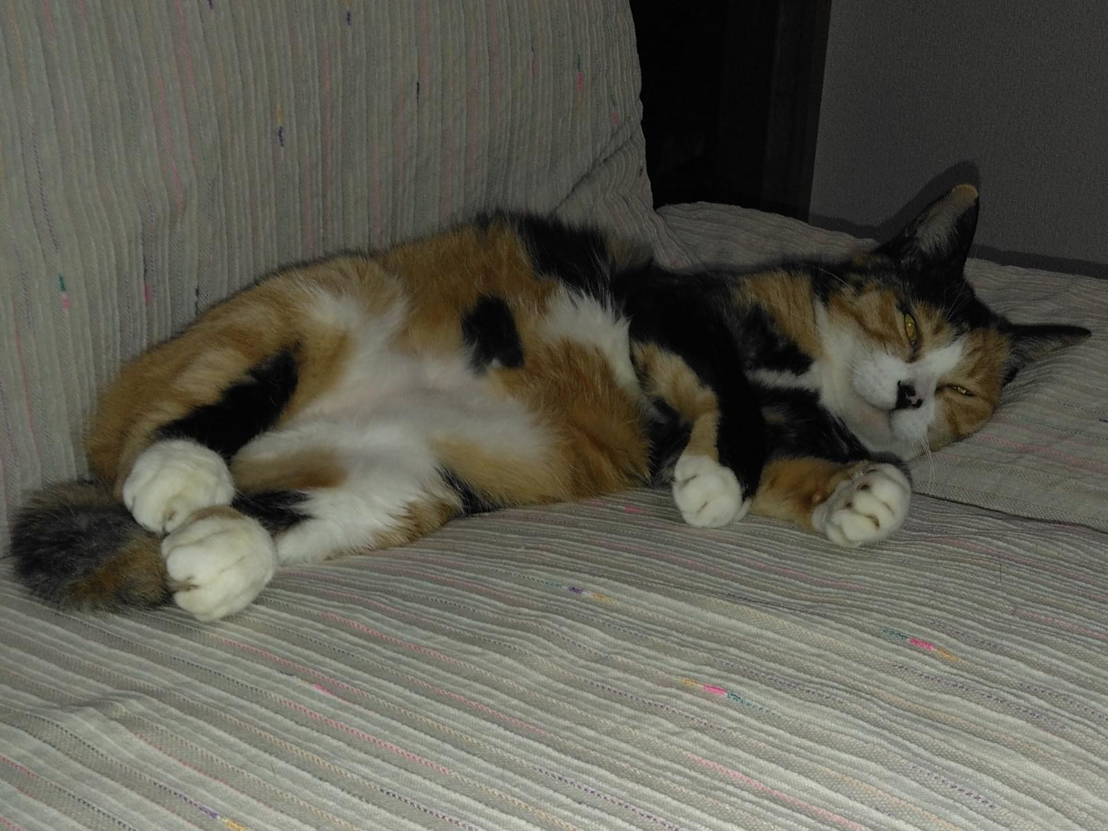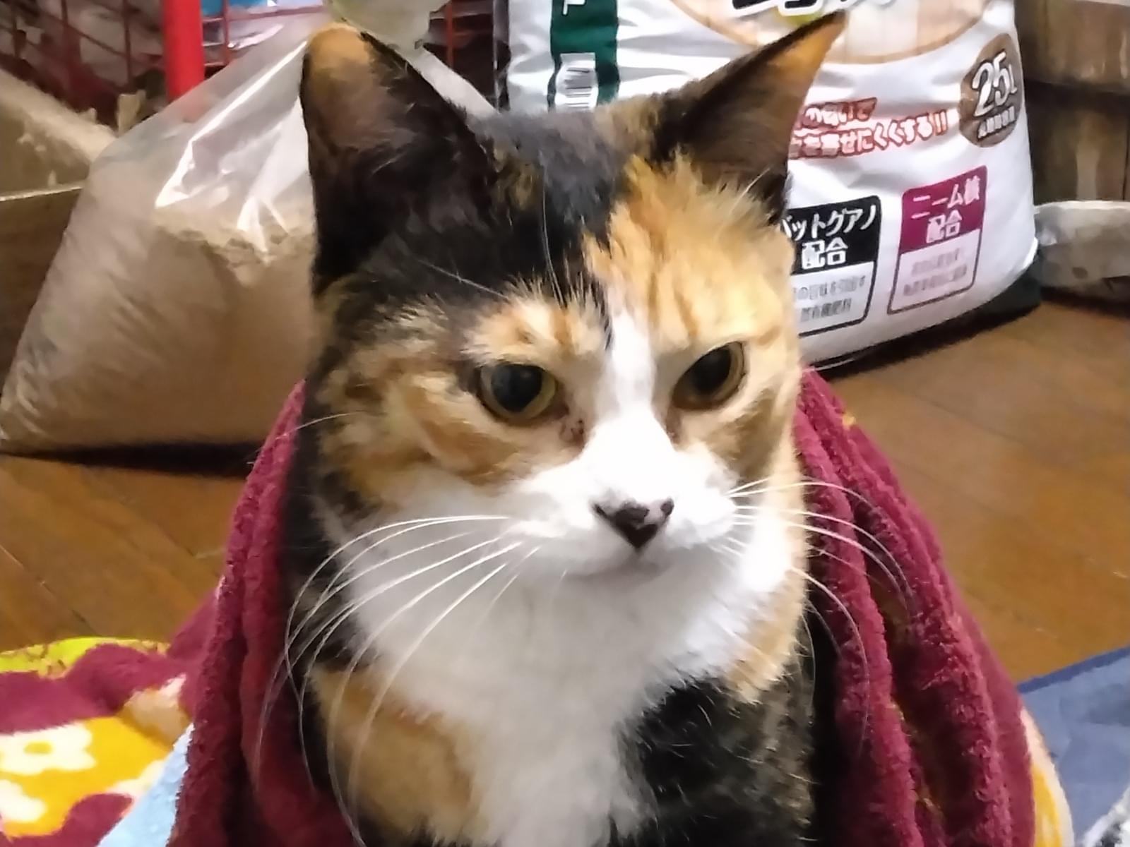 お腹を怪我した三毛猫です