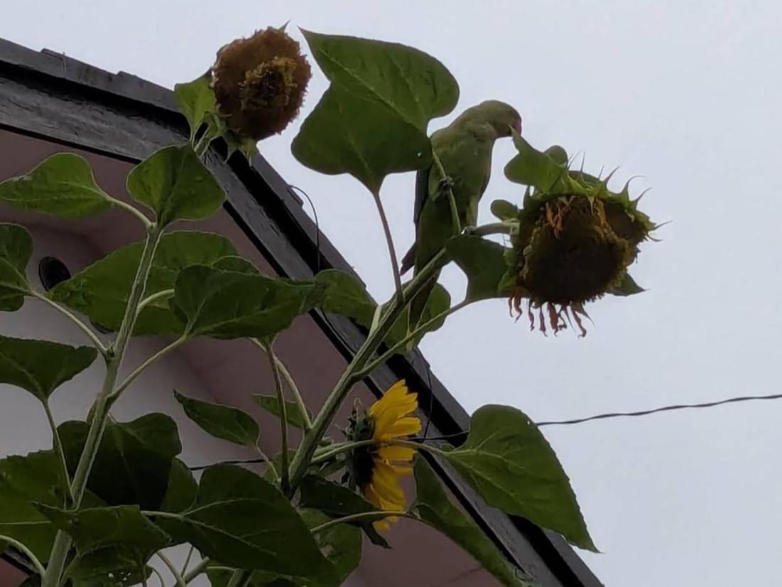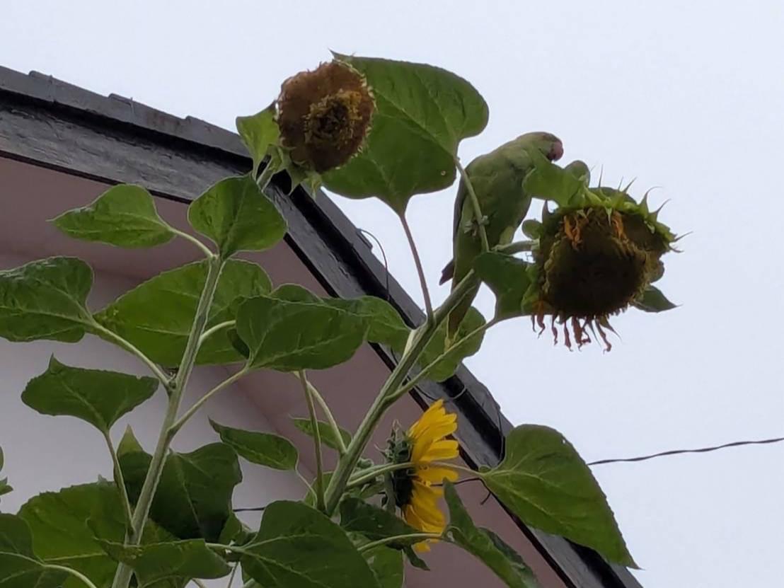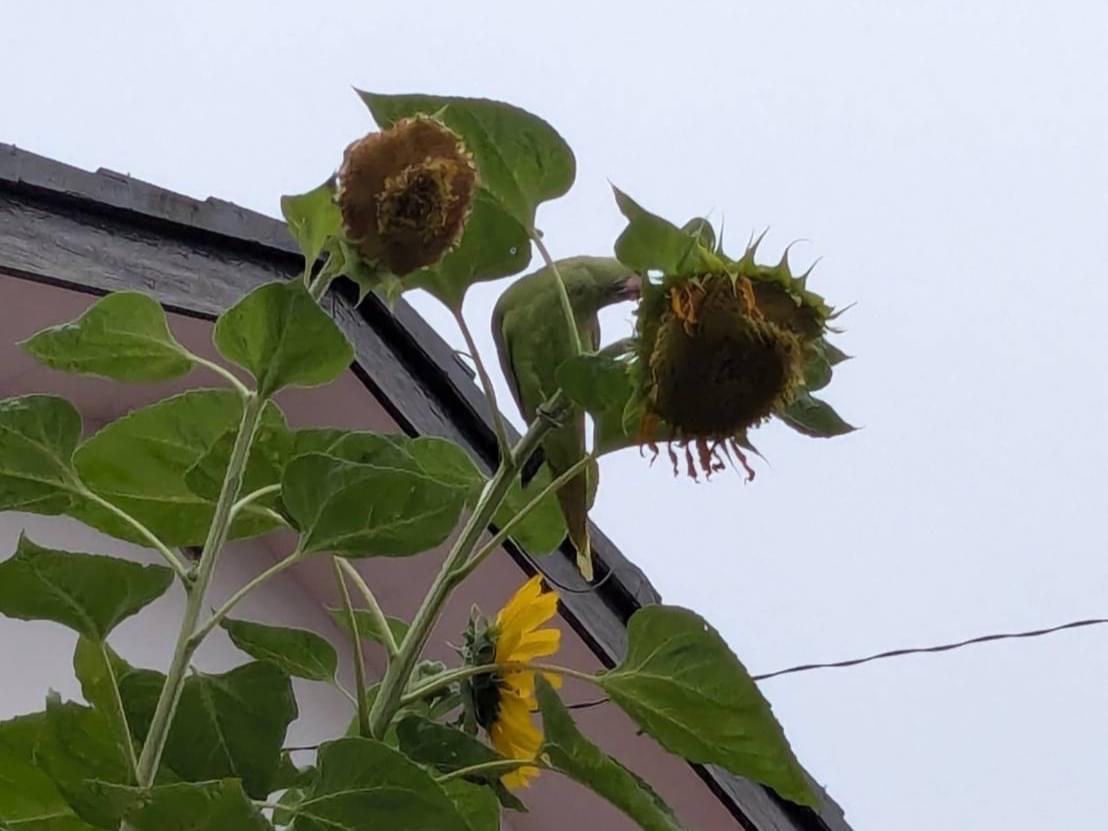 近所の花壇でひまわりの種を食べてます。
