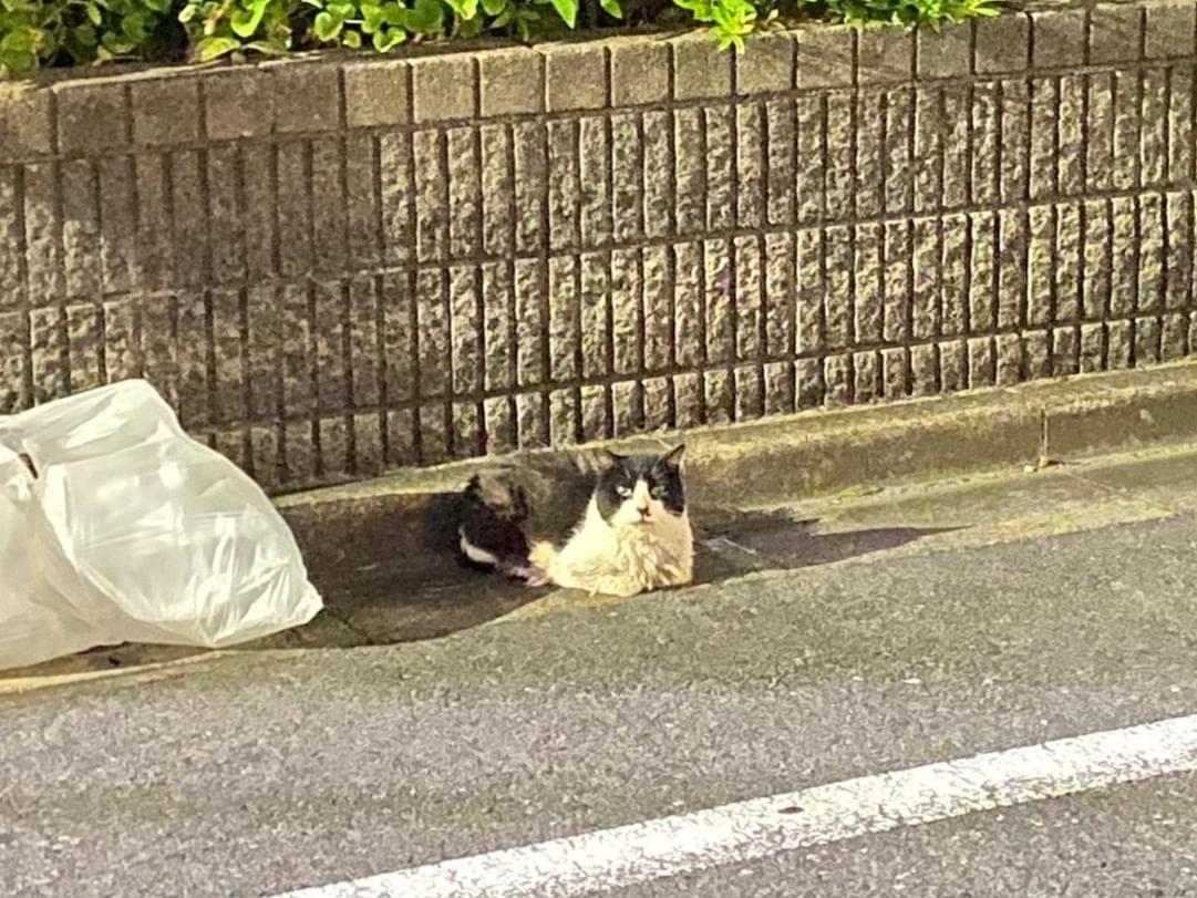 30分ほどしてまた様子を見に行きましたが変わらず道路のそばのゴミ置き場の横で香箱座りをしていました。