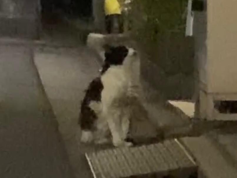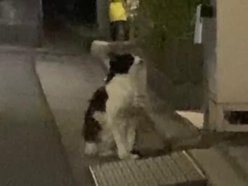 じっとアパートの2階を見上げ続ける白黒(黒白)のハチワレ猫ちゃんがいました。