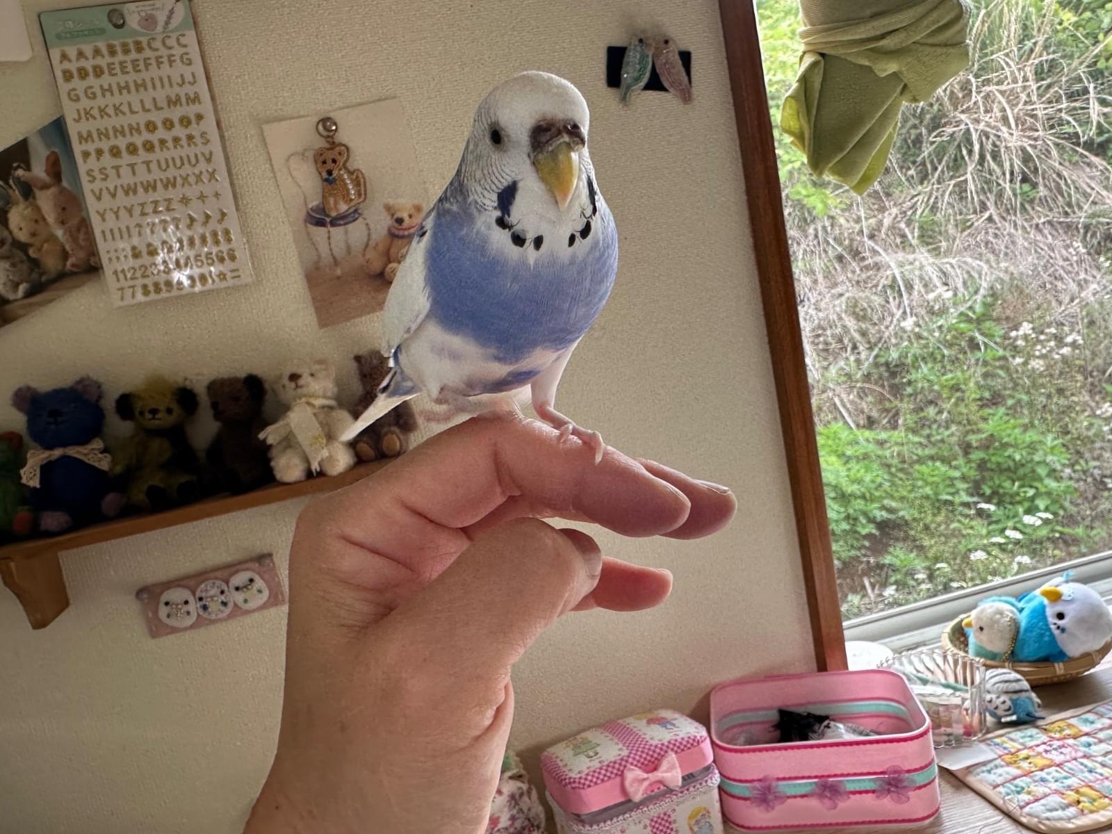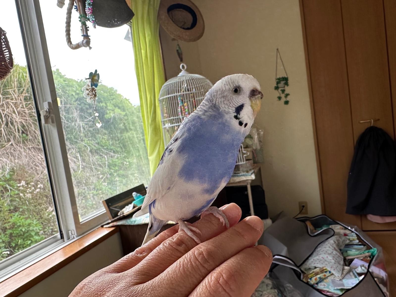 一歳の白とブルーのセキセイインコが迷子になりました。手乗りでアナちゃんと呼ぶと肩に乗ります
