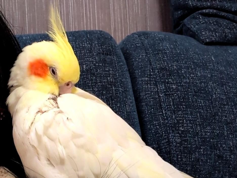 黄色で頬にオレンジの丸い模様のある、オカメインコを探しています。足と嘴はピンクです。羽の内側は自分でむしってしまい、地肌が見えています。警戒心は強く、掴まれるのは苦手ですが、人の頭や肩に止まるのは好きです。