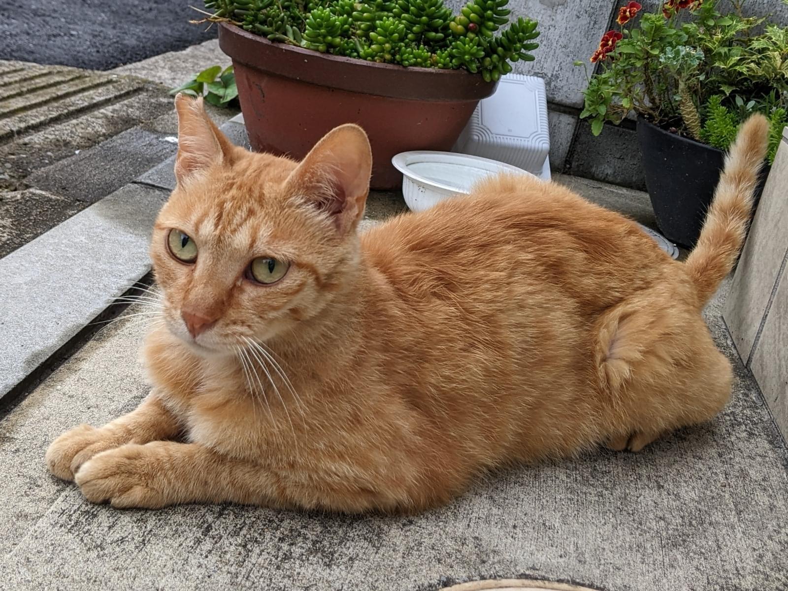 7月半ばくらいから玄関先で雨宿りをしてました。毎日来るようになり、よく見ると去勢済の雄のようです。人懐こく細い声で鳴き甘えてきます。1歳未満の子だと思われます。家の中に入ろうとするので飼われてたのではないかと思います。