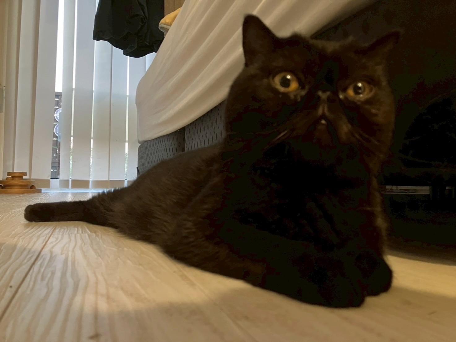 黒いエキゾチックショートヘアの雄、去勢済みです。マイクロチップあり、首輪はしていません。太めの鍵しっぽです。人懐こく、穏やかです。運動神経が悪く、高いところは登れないか、降りれないです。