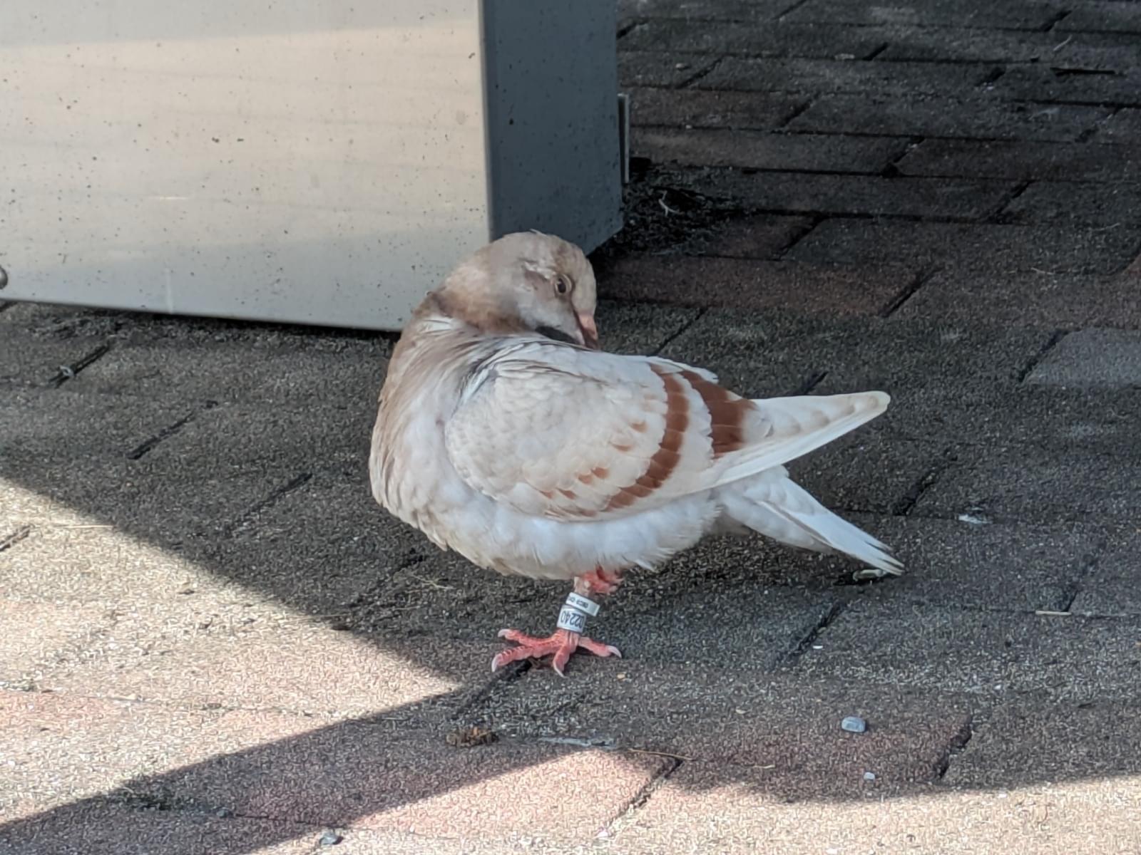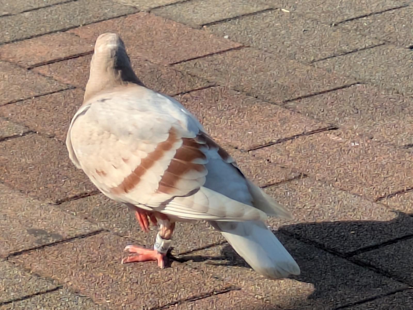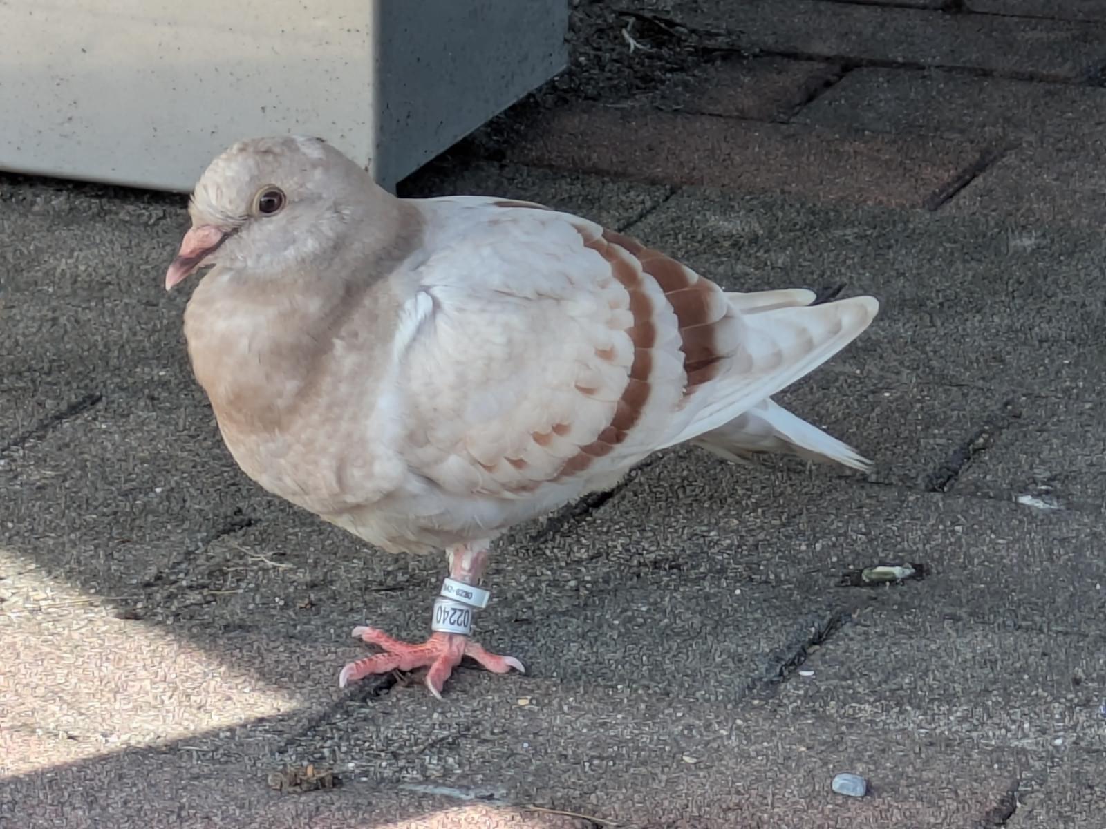 休んでいる綺麗なハトがいたのでみていました。3時間後ぐらいに見たら、まだ同じ場所で休んでいました。歩いたときに足環をしていたので、どなたか探しているのでは、と共有させていただきました。見ているうちにほんのすぐ側の草むらに飛んでいきました。それからはわかりません。足環の番号は全ては見えませんが、02240というのが見えます。