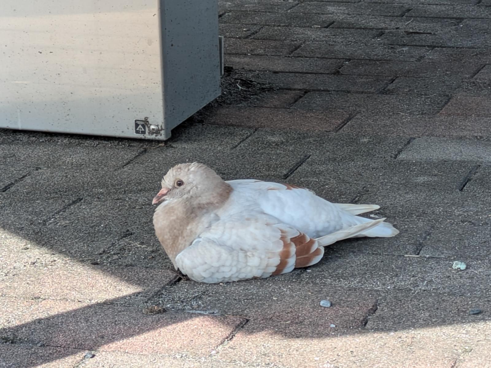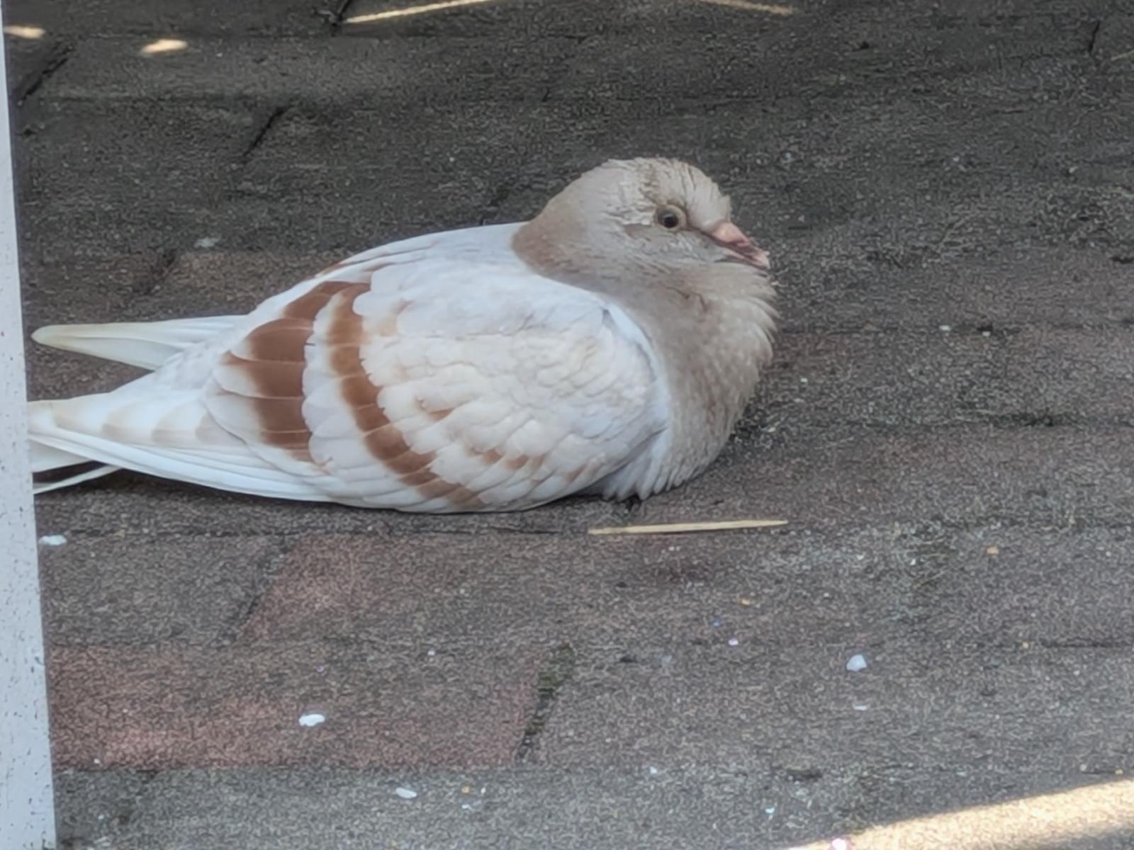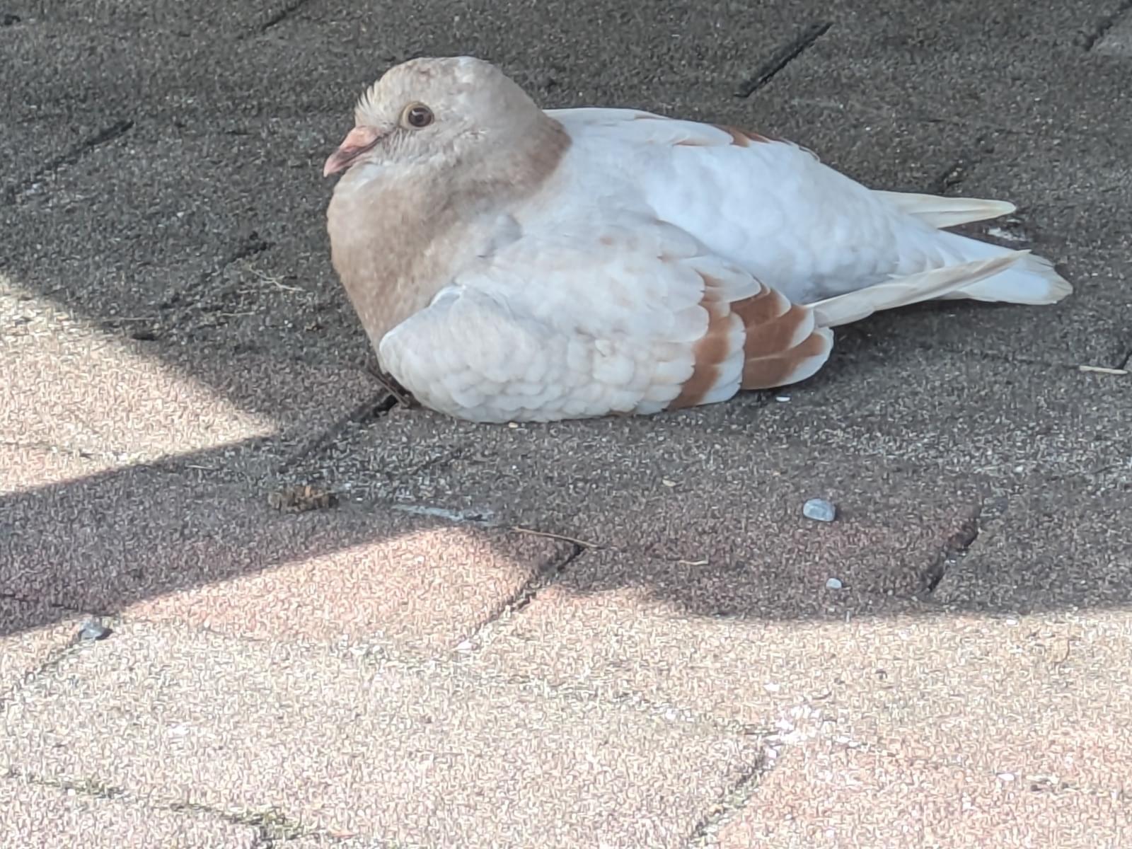 休んでいる綺麗なハトがいたのでみていました。3時間後ぐらいに見たら、まだ同じ場所で休んでいました。歩いたときに足環をしていたので、どなたか探しているのでは、と共有させていただきました。見ているうちにほんのすぐ側の草むらに飛んでいきました。それからはわかりません。足環の番号は全ては見えませんが、02240というのが見えます。