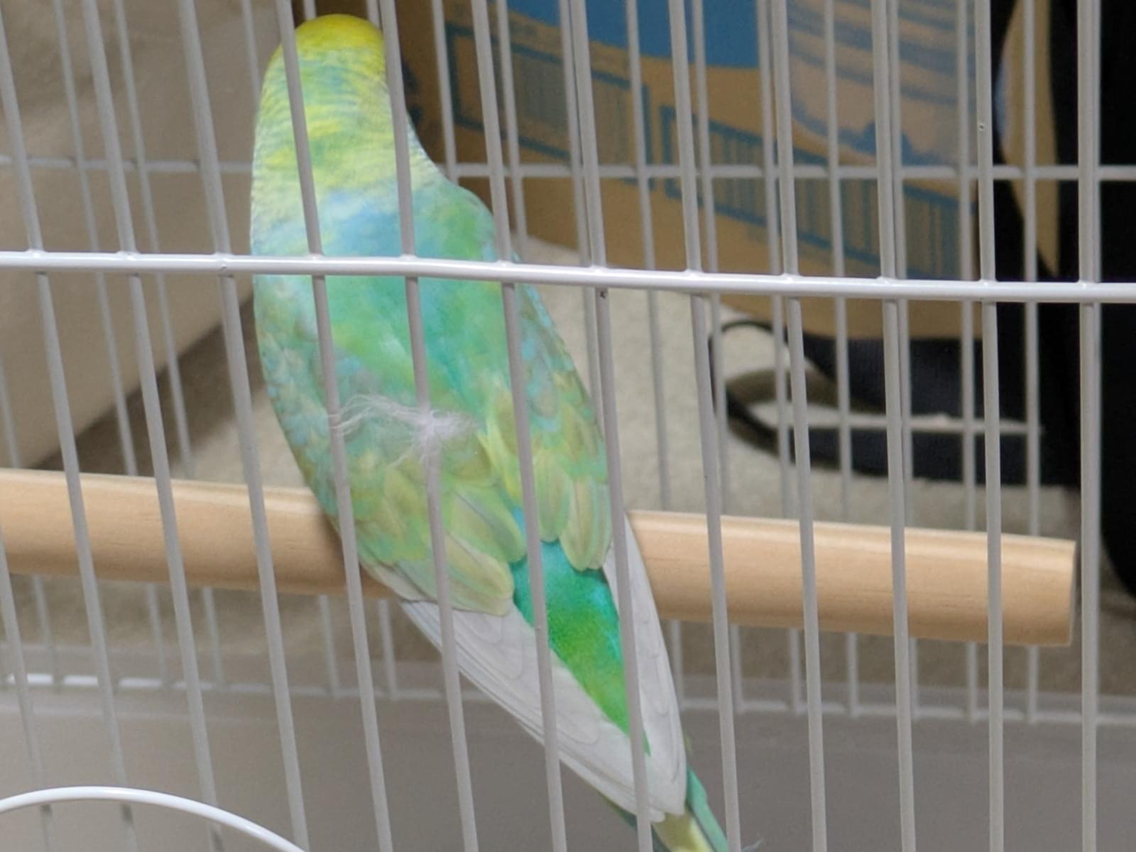・全体的に緑よりはエメラルドブルーよりなボディ、セキセイ特融の黒い模様はほぼなく、羽も薄めのグレー。
