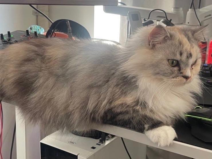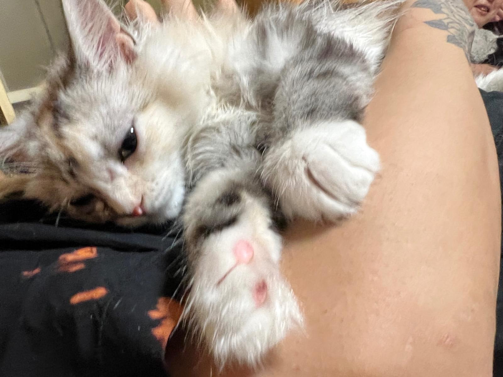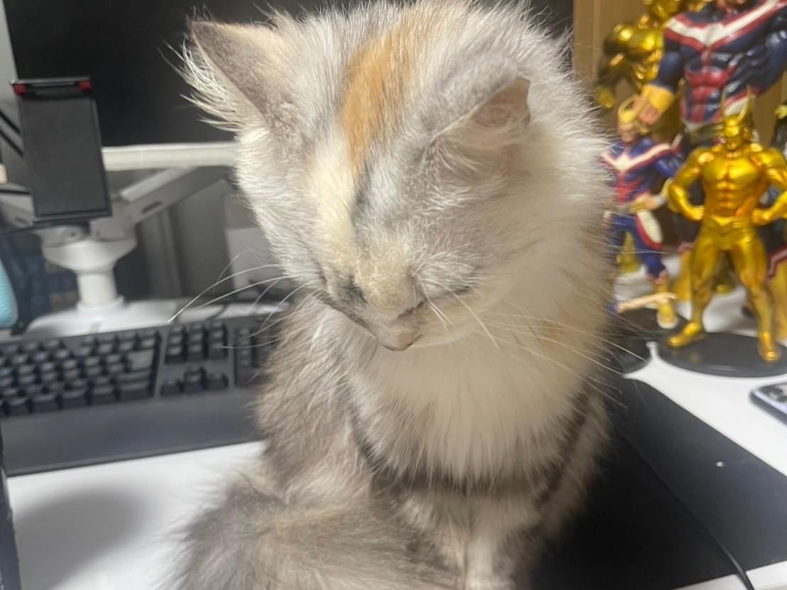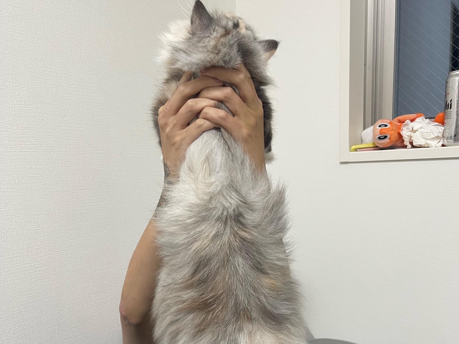 首輪をつけていなく 長毛のマーブル柄で 白茶灰色の毛色