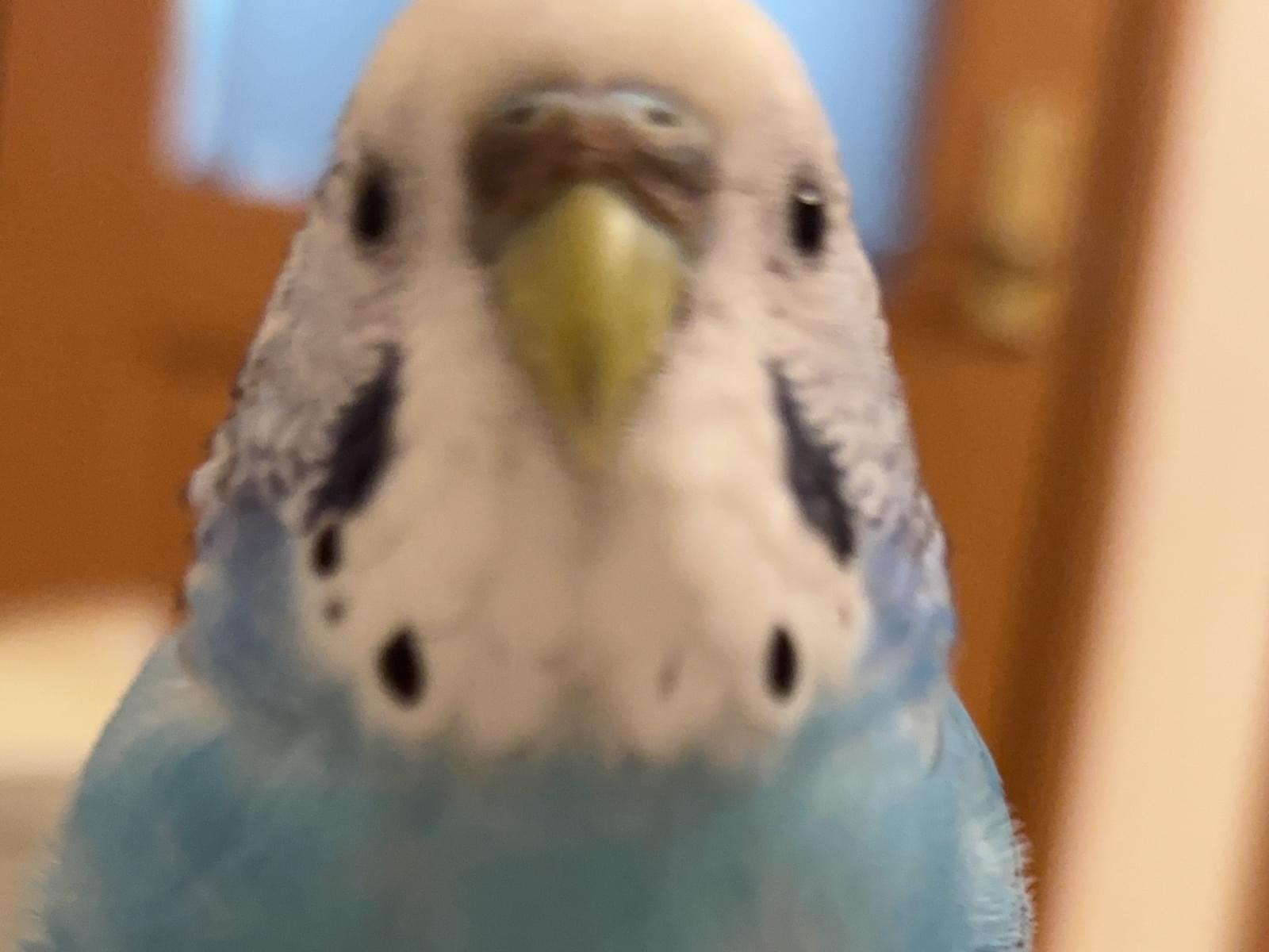 水色のインコ、鼻が青色に茶色がかっている色で「まりもちゃん」と話します