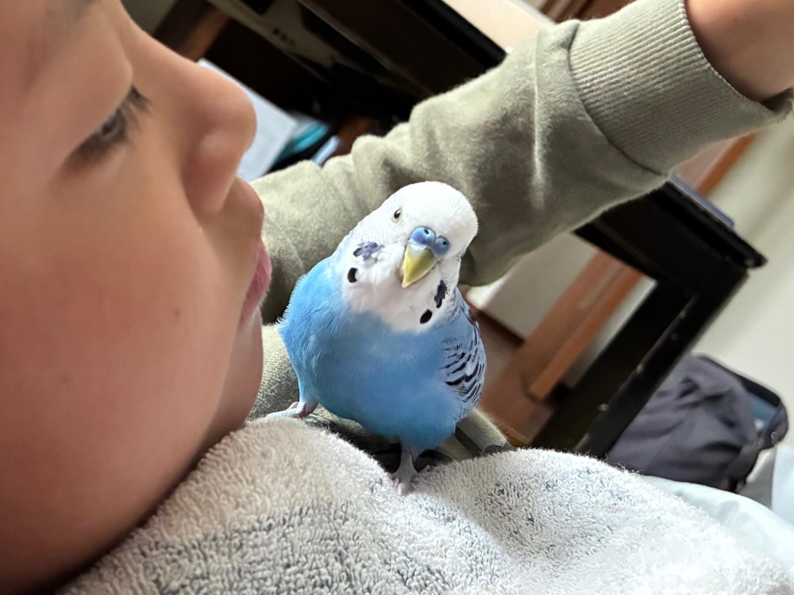 肩に乗り、人懐こいインコです。「ピット」「みつき」等喋ります。