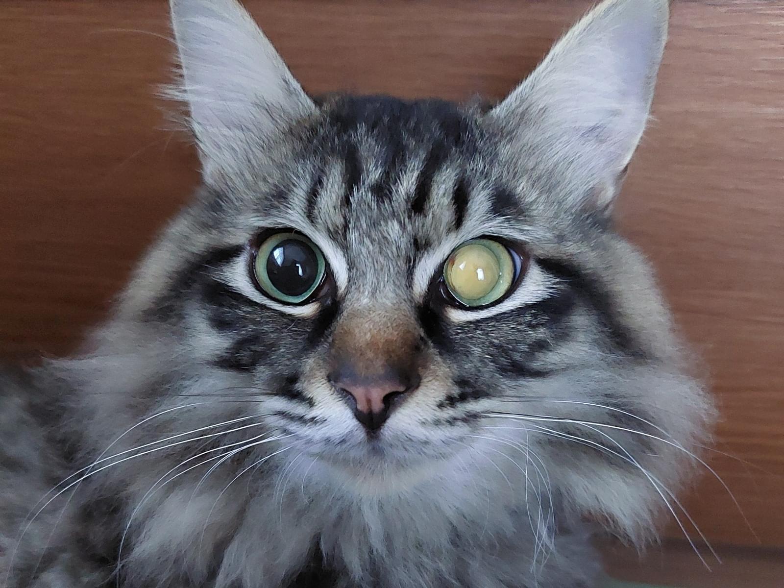 長毛キジトラですが、全体黒多めでサバトラにも見えます。身体はサマーカットしていますが尻尾はそのまま。