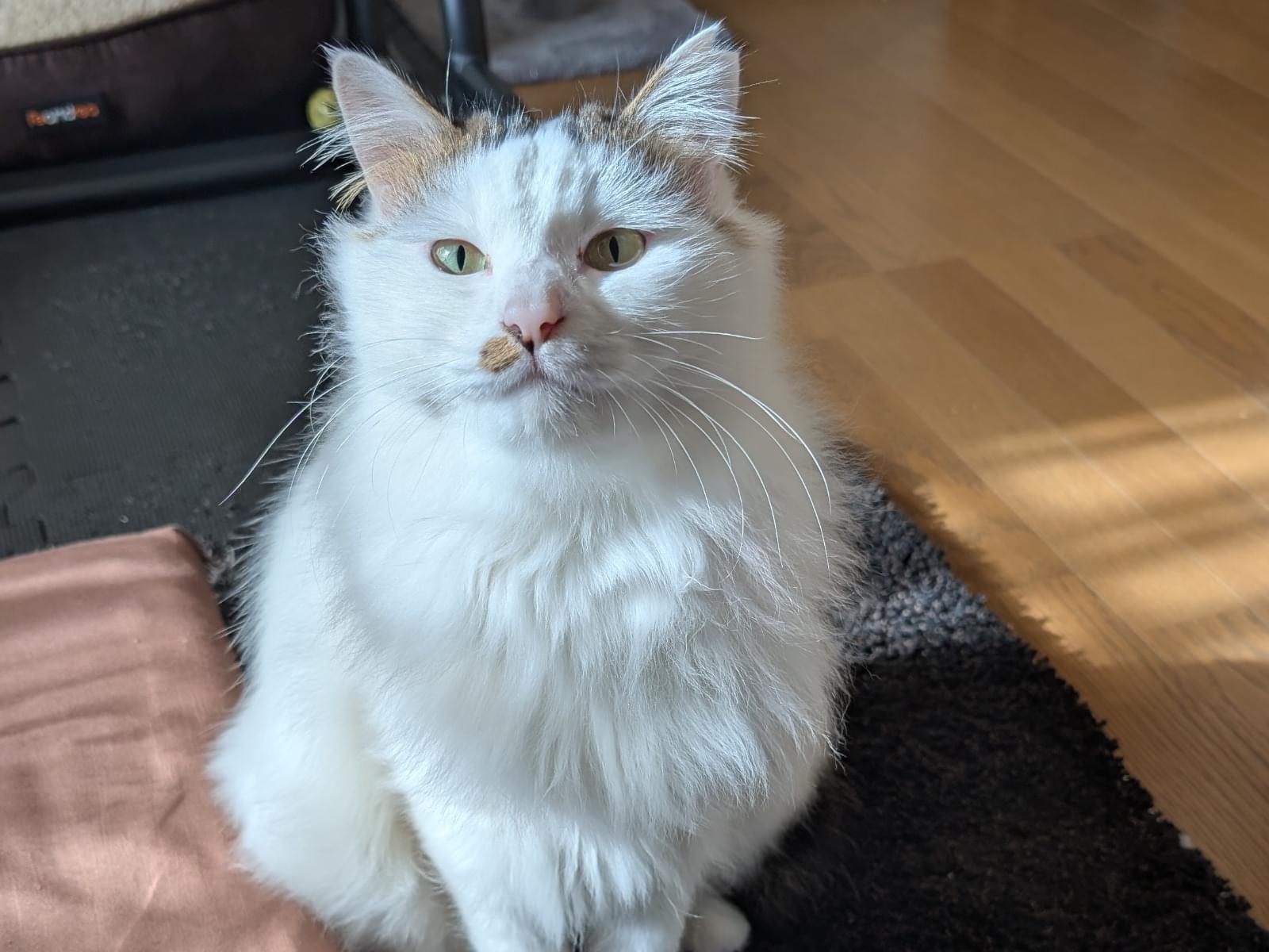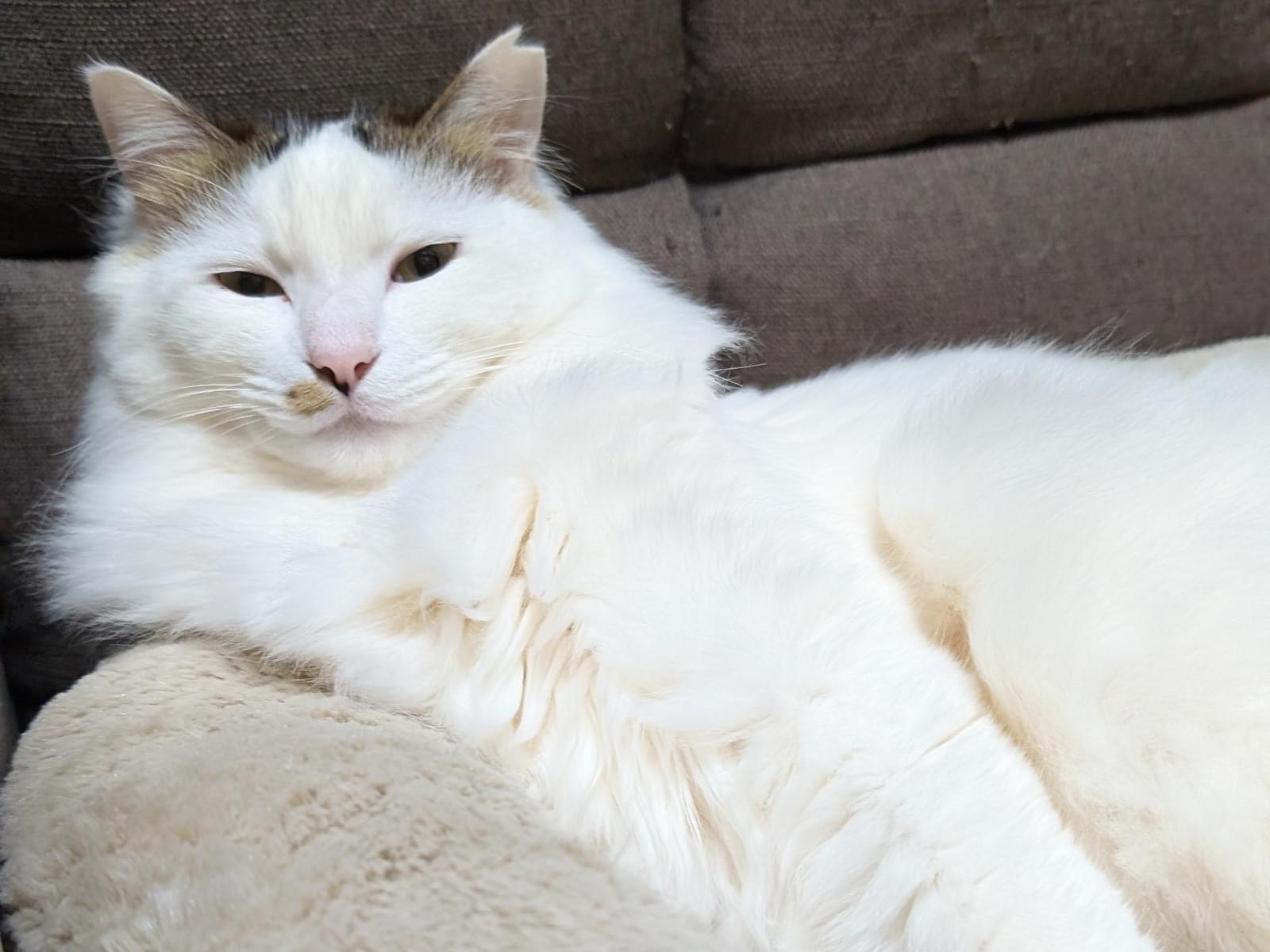 カギ尾の白い猫で耳と尾が黒いです。背中に1箇所だけ黒い斑点があります。