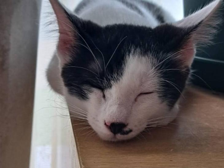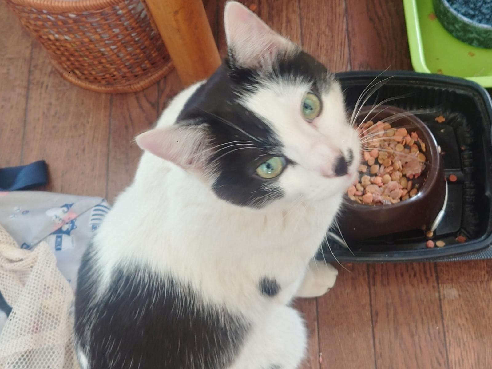 ハチワレ猫で、鼻の左側に黒の点があるのが特徴です。目は薄いグリーンで尻尾は短めの黒です。