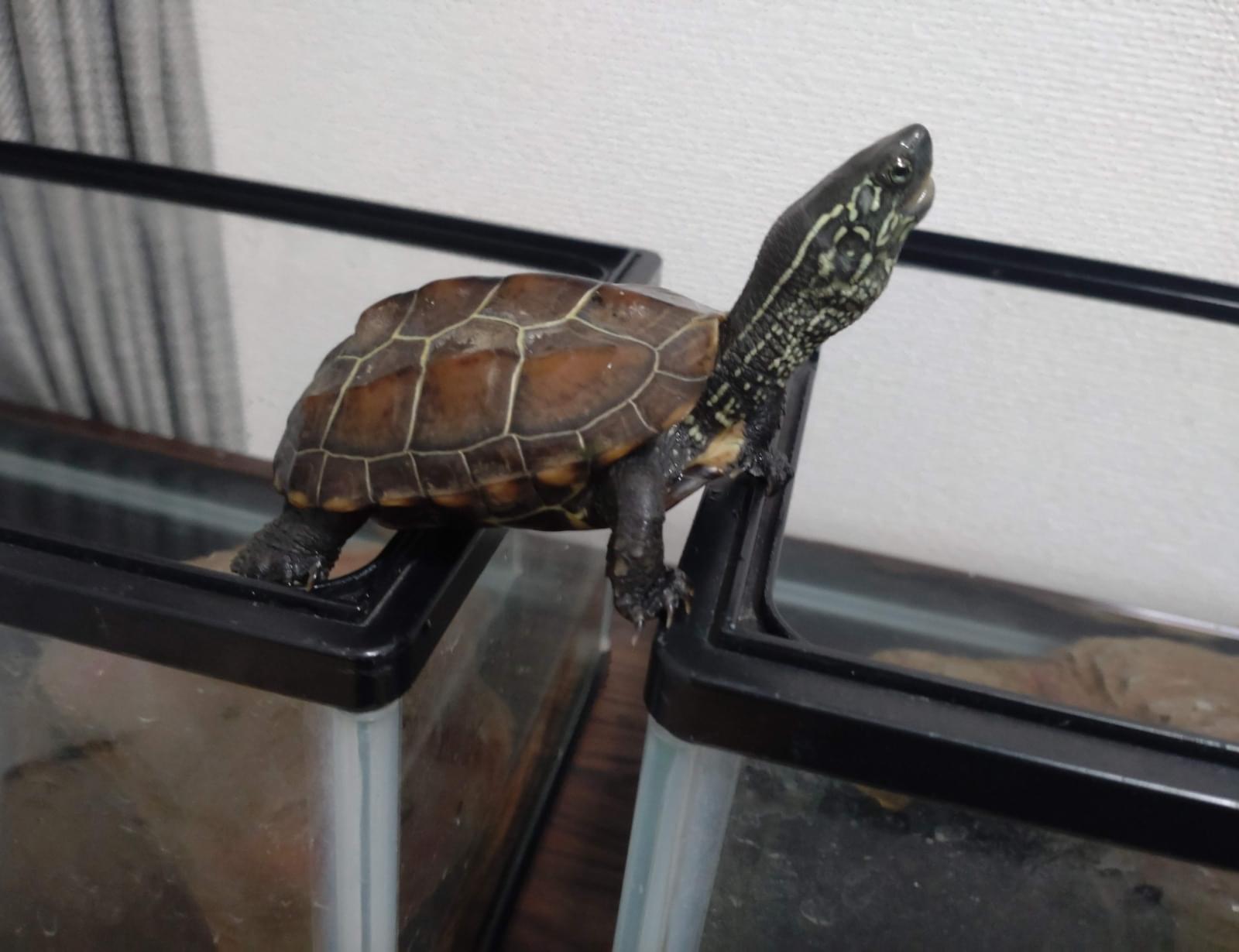 夕方、庭に水槽を出している時に、水槽の置物を足ががりにして脱走しました。