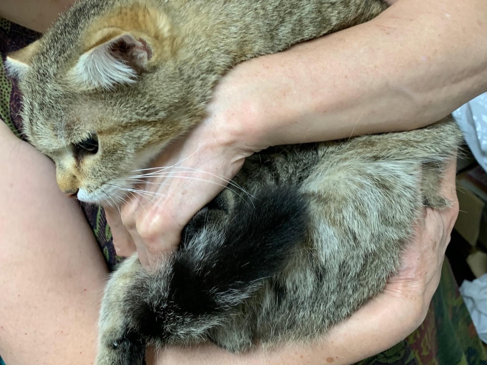 高い声で鳴き、足に擦り寄ってきたメスのキジ猫を保護しています。