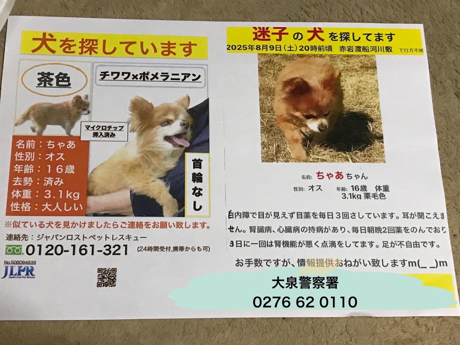 8月9日千代田町の赤岩渡船河川敷を夜8時前ごろ散歩中、突然行方不明になってしまいました。当日管理室の前で花火を観覧された方、車で河川敷を通行されてた方がいらっしゃいましたが、迷子犬を見なかったでしょうか?行方不明から2ヶ月、どなかたかちゃあを保護してくださっておりましたら、ご連絡御願い致します。