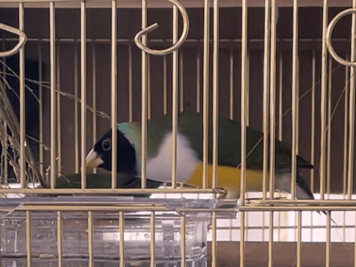 色は顔が黒色で、首から胸下までが白色で、胸下から足の方までが黄色で背中が緑色です。それと首周りに水色がちょっと入っています。