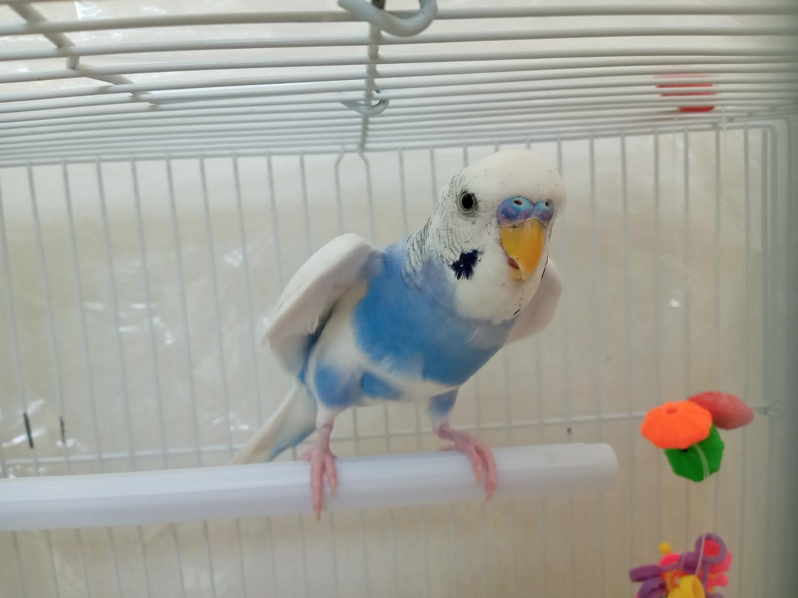 白と青の色羽でクチバシは黄色のオスのセキセイインコです。
