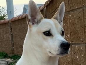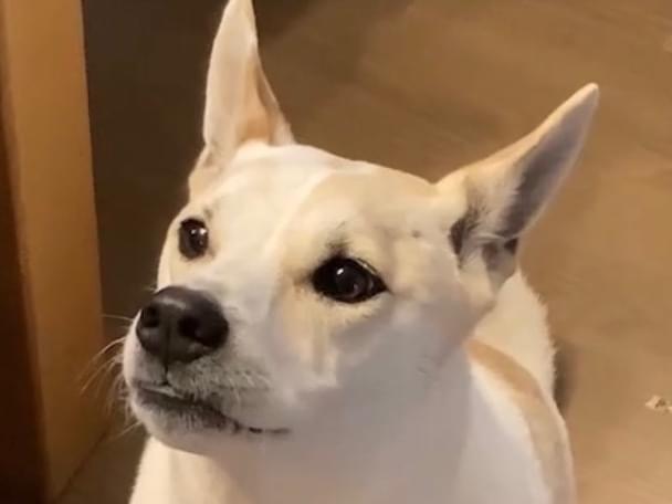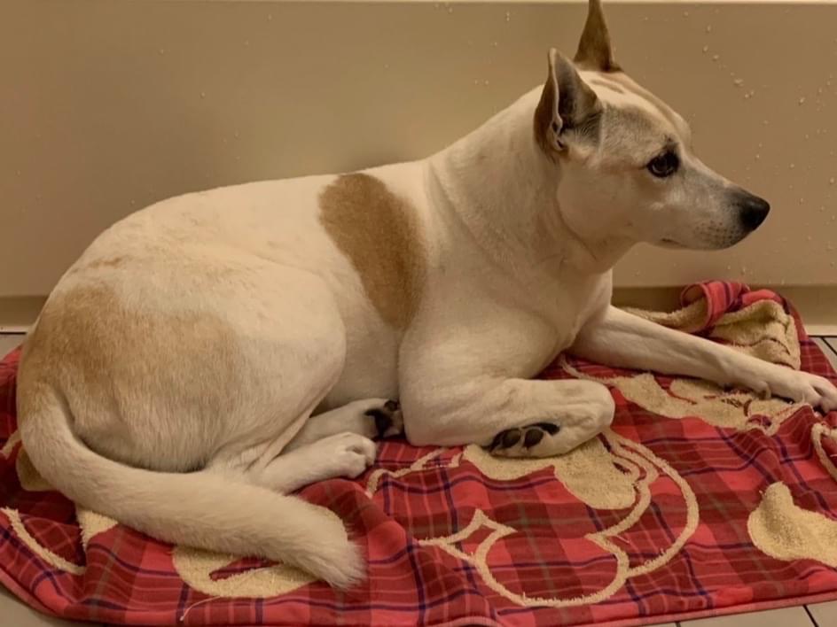 全体は、白色ですが、薄い茶色のブチのある保護犬(雑種)を探してます。